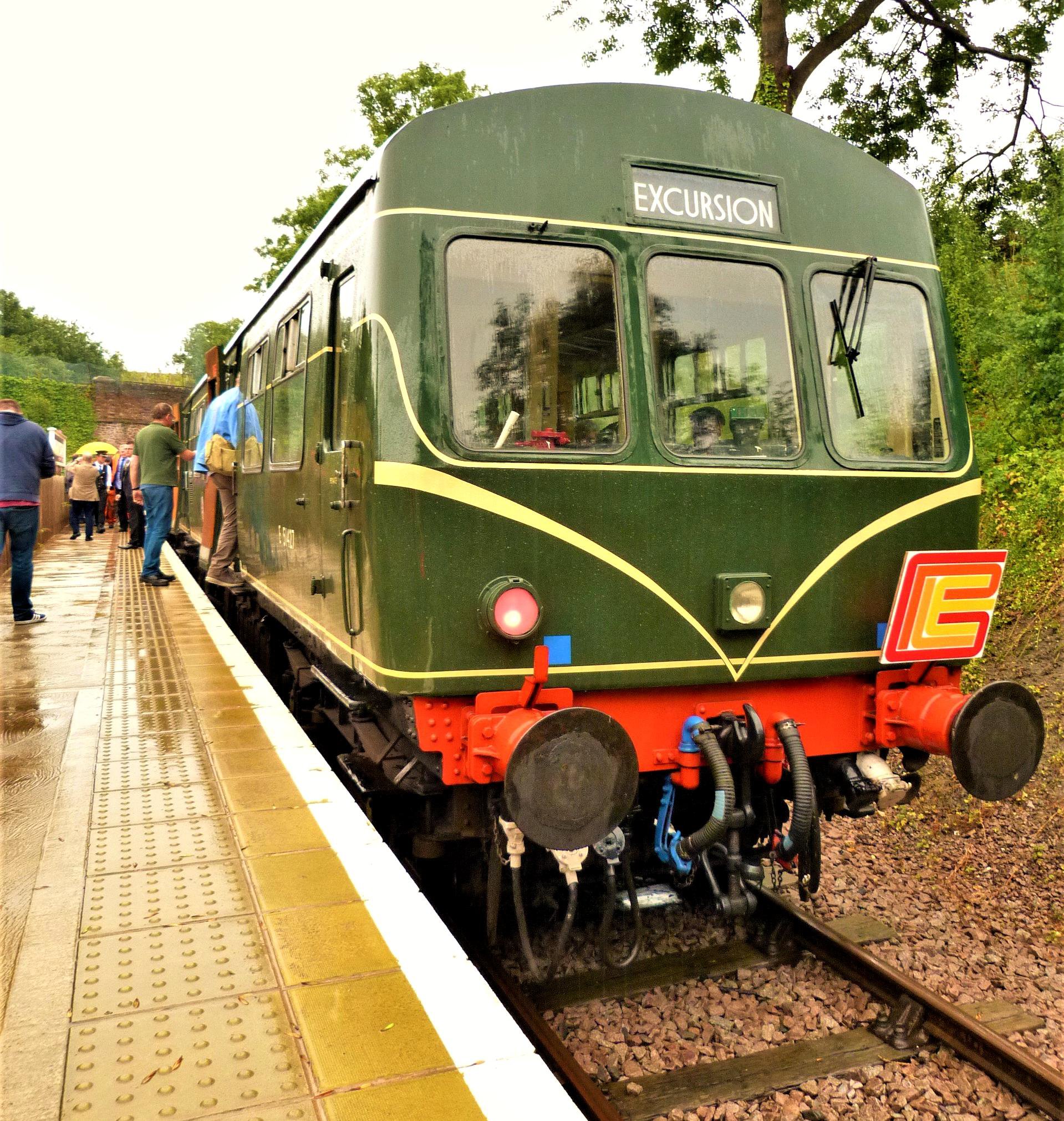 Departure was on time at 18.00 (allowing some to visit Kingmoor DRS Depot open day earlier!). Locos 08907 and D3690 (formerly 08528) made light work of the nonstop journey to Rothley Brook passing through Quorn & Woodhouse, Swithland Up Loop and Rothley P1. Rothley Brook is where the eponymous watercourse flows beneath the railway. Here the train reversed and now hauled by 08694 (added to the stock at Loughborough Central) returned the short distance to Rothley P2 where this leg of the tour terminated. Almost simultaneously the stock for the Mountsorrel branch formed of three car Metropolitan Cammell DMU vehicles 50266, 50321 and 51427 arrived at P1 on the opposite face of the island platform. A rain shower discouraged dilly dallying and participants moved quickly to the DMU for the 'The Mountsorrel Railway' journey, for many the highlight of the event.
