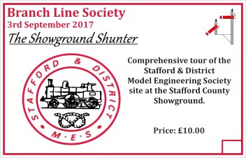 The 18 participants arrived for 14.00 at the 70 acre Stafford Country Agricultural Show Ground after the morning Baggeridge visit. There was a Dolls House show on and the railway was eventually found tucked away in a rather secluded northern corner. It is only has public running once or twice a year during the main showground events. A 2015 extension has converted the layout from a 250yd oval in to a 590yd dumbbell. Waiting at Stafford & District Model Engineering Society's Bagnall End station was 0-6-0 TT WB No6 'Waldenburg' in green livery with three blue sit astride coaches, its driver and guard as well as a signalman for the 5"/7¼" ground level line. The loco is a scale model of a narrow gauge tank loco built by SLM in Winterthur [2276 of 1912] for the Waldenburg Bahn; the prototype is preserved in the Swiss Museum of Transport, Lucerne, and it performed admirably throughout the afternoon.