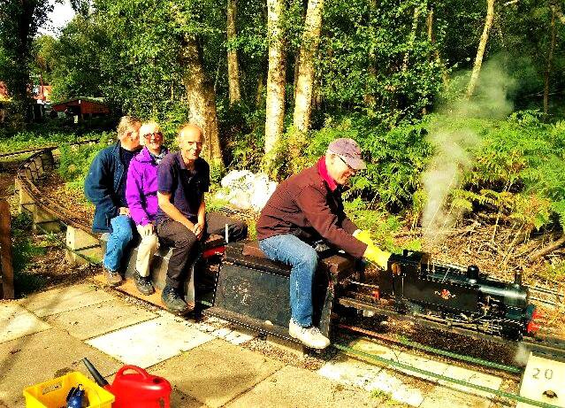 12 members and friends met at the home of the Mid Cheshire Society of Model Engineers (MCSME) near Northwich, our first visit to this site since they moved from their nearby Pettypool site (which closed 30 Oct 2011). The group received a very warm welcome, including drinks and biscuits, during an initial workshop and carriage shed visit. Before long 'Vivien', a 7¼" 0-4-0 narrow gauge saddle tank arrived and participants rode round the 390yd mixed 5"/7¼" gauge ground level circuit which runs through the delightful Sandiway Wood. The route was designed to avoid certain trees; at one point an extra riding vehicle was attached to accommodate some 'normal' passengers! Meanwhile a 5" gauge tank engine was steamed up on the now complete 3½"/5" gauge raised track. This is very solidly built on numerous concrete plinths with foundations connected by concrete segments all braced by metal work, and should last many years. The elevated circuit (not in public operation) doesn't run often and like many such lines the run was exhilarating. Two 'specials' gave the party a trip on the very rare ground level Woodside station avoider, apparently the first passenger train to run along it and over both sets of points.