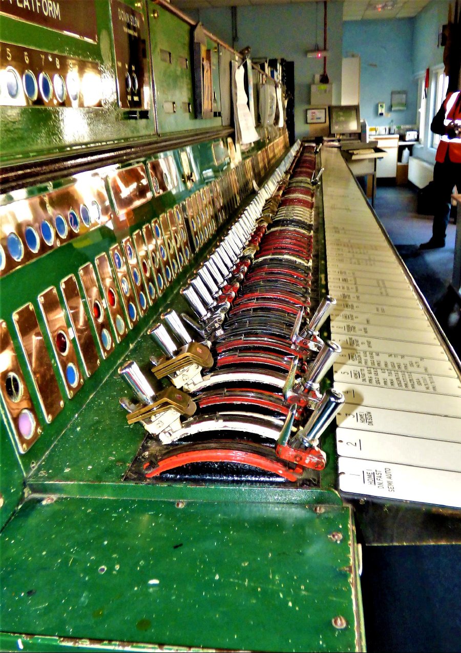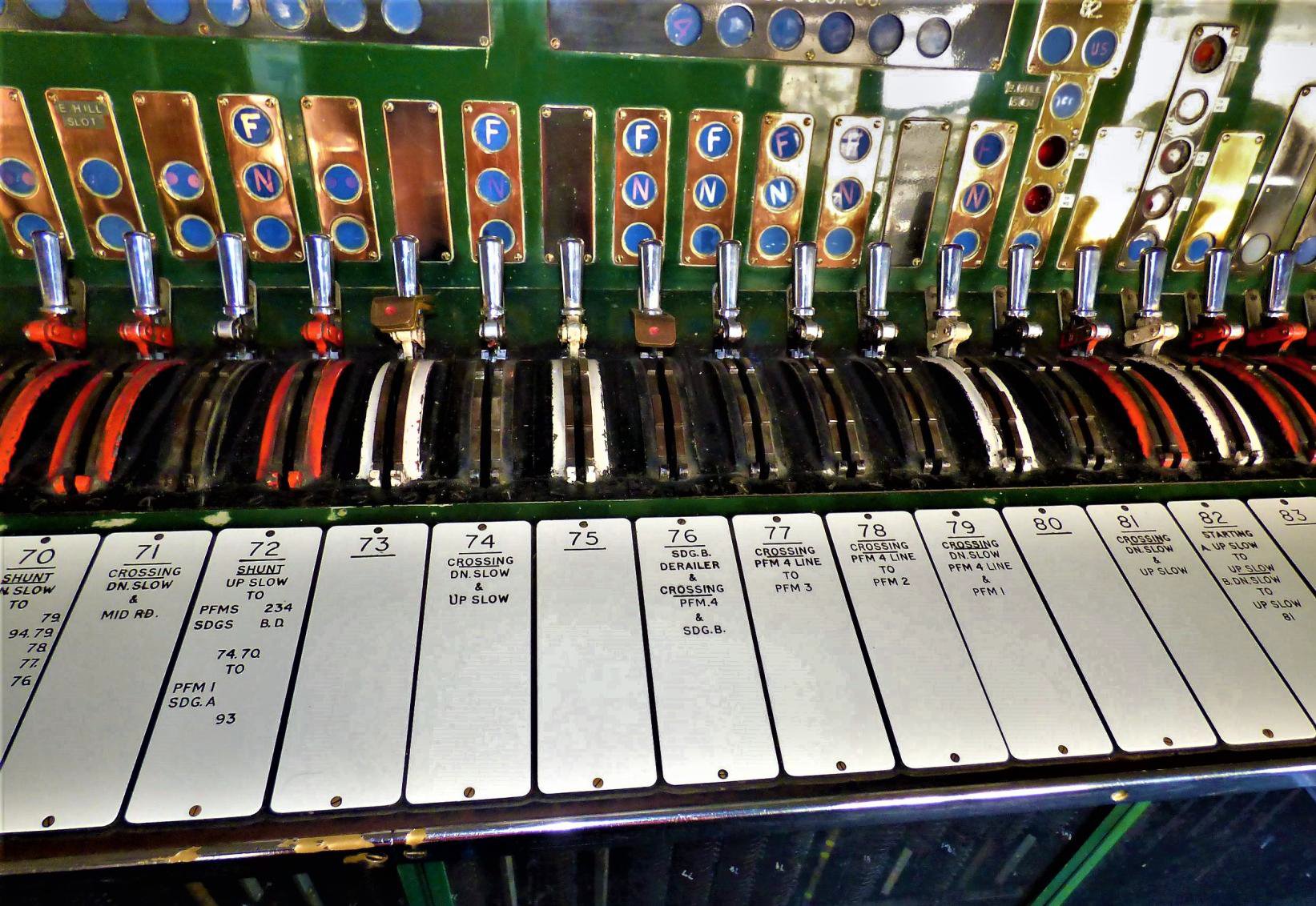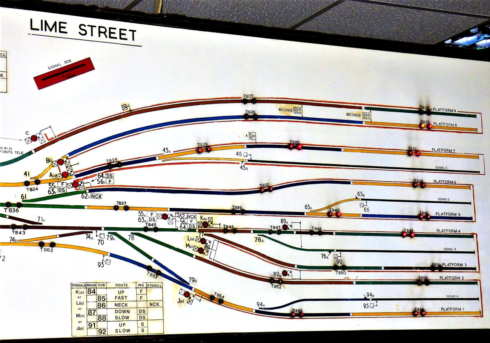 There are some other unusual features, such as two 'train running away' indicators, one for the Down Fast and one for the Down Slow, activated when approaching trains pass signals at danger. This is a significant possibility since the line from Edge Hill descends at a maximum gradient of 1 in 83. (From opening in August 1863 to 1870 locomotives detached at Edge Hill and the coaches gravitated down to Lime Street with brakesmen. A stationary steam engine at Edge Hill hauled the carriages 'up' by rope.)