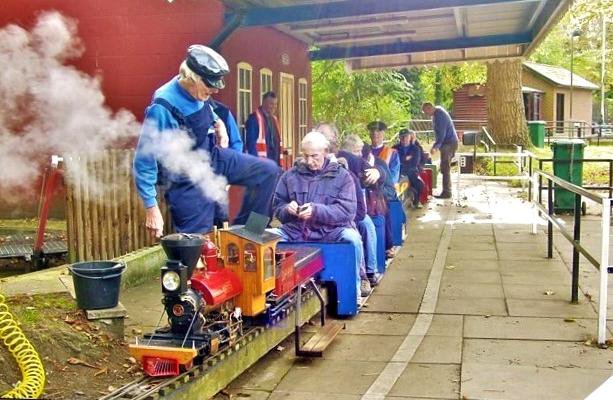 After everyone had ridden and achieved overlap we thanked the driver who, like everyone else at all the locations this weekend, went out of his way to accommodate us! It was a lovely sunny morning and with our next location within easy walking distance, most chose this (healthy) option! Willen Lake Miniature Railway (WLMR) is a 7¼" gauge 600yd ground level balloon loop from Willen 'Holt'. (Per station building, but 'Halt' on the nameboards, and not a single otter in sight!) A maroon liveried diesel hydraulic loco appeared from the shed (there is also a near identical petrol version). The stock, to our surprise, wasn't in secure storage like the locos, but stacked on top of each other on wooden pallets placed on the ground close to the shed and covered by a tarpaulin. This seemed risky in a town public park, but apparently there have been no problems apart from the odd inquisitive teenager who might peel back the tarpaulin to have a look! People power was needed to assemble the train and we started from the shed approach by propelling into each of the three shed roads to the doors, pulling forward over the level crossing to the station each time to avoid fouling the footpath/cycleway.