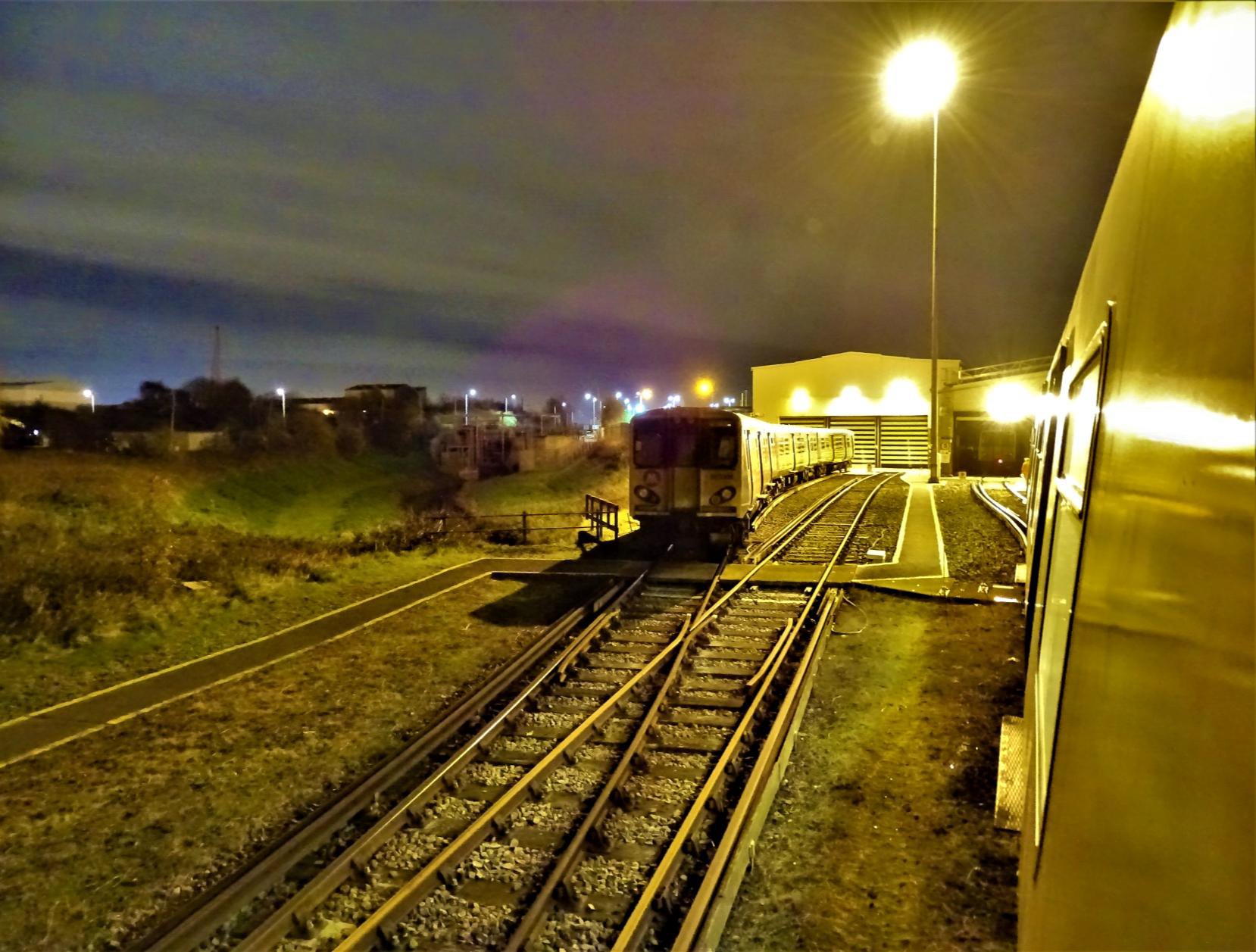 After Kirkdale it was off to Bidston via reversals at Walton Jn and Liverpool Central then via the Stock Interchange Line pausing at James Street P2. It was dark as we made the short trip from bidirectional Bidston P2 to the Stabling Siding which was once part of the curve and third side of the triangle to Seacombe Jn. To make up for not being able to see much the traincrew kindly turned the carriage lights off for the 25 minutes* or so we were in the siding. To keep us entertained, bizarrely music from 1970s/80s TV adverts was played over the PA (a BLS first?)! *Arriva Trains Wales Wrexham Central DMUs also use P2; on a Sunday they are roughly every 2½ hours with a 20 minute wait here and have to retreat ECS for a Down EMU. We had to wait in the siding for this to happen, but covered the trailing crossover three times. The signalling does not allow reversal in Bidston P1. When (SuX) the Wrexham service is hourly (with two DMUs) their reversal in P2 is, at times, almost instantaneous!
