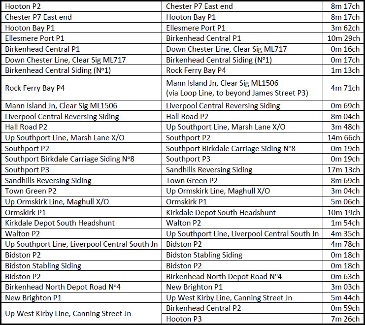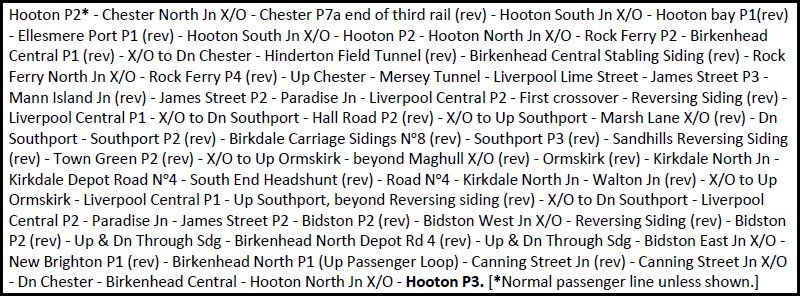 Another 'comfort break' at New Brighton followed and we set off back to Hooton taking in the rare Birkenhead North P1 (the Up Passenger Loop) then reversing at Canning Street Jn to regain the Down Chester for a quick run to Hooton where we arrived P3 right on time at 18.47. Another very enjoyable day with the friendly Merseyrail staff and very little waiting about so we covered much track.