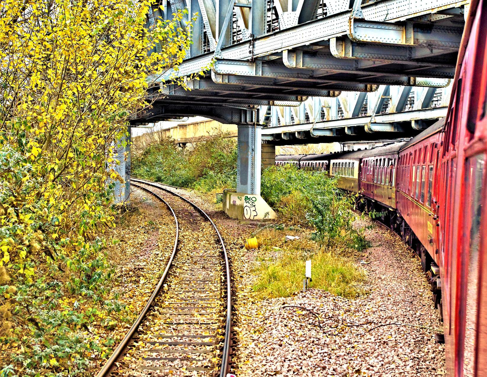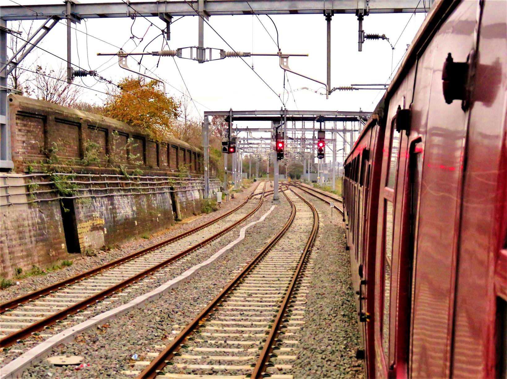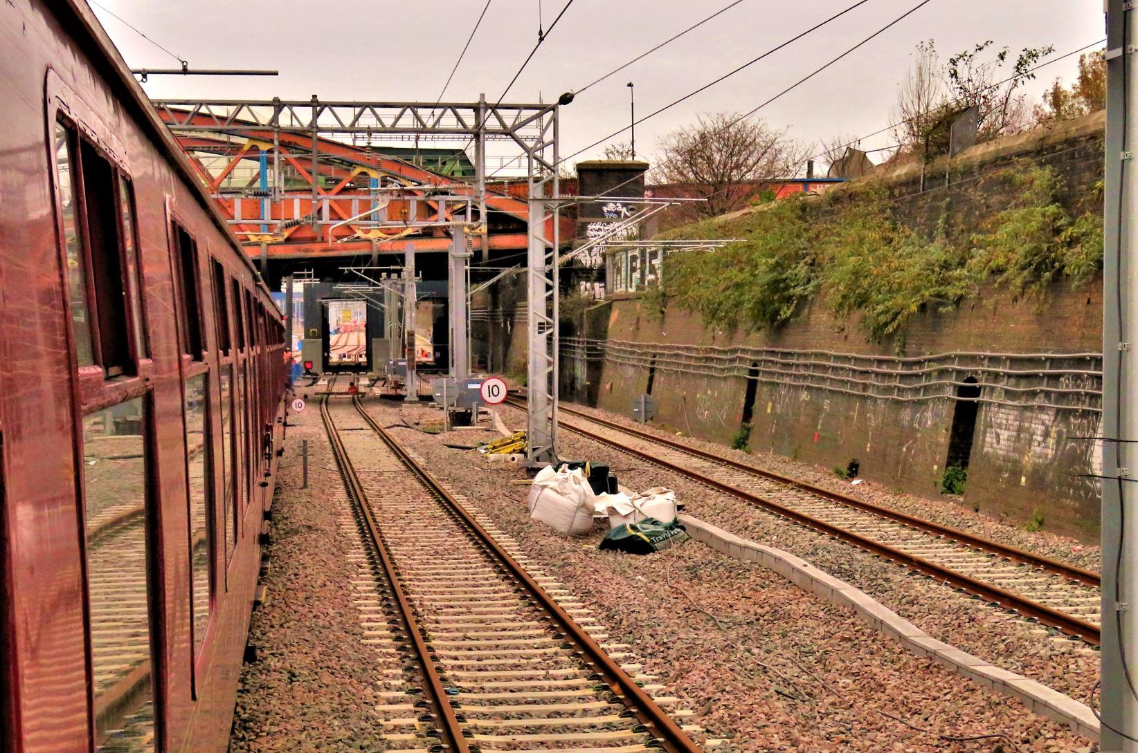 Looking towards the rear of the train after reversal at Greenford West Jn, the tour heads towards Greenford South Jn at Greenford (LUL) Bay Jn under the LUL Central Line bridges. The line trailing in from the left is indeed from Greenford bay P2.