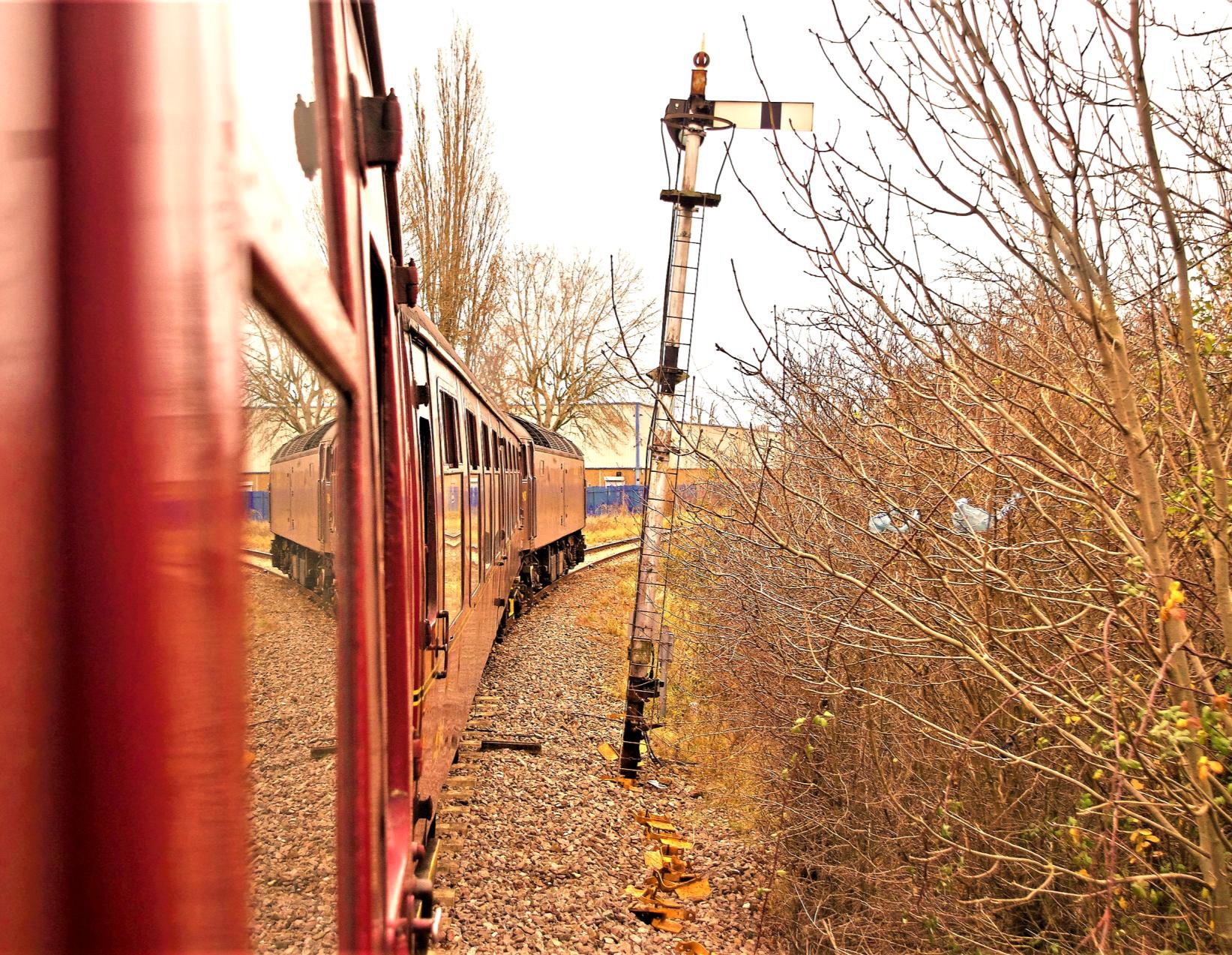 The leaning signal of Greenford. 47245 leading our tour along the Up & Down Loop from Greenford South Jn to Greenford East Jn passing Signal GE67, Greenford East signal box's Up Starter from the eastern chord towards West Ealing. Although used frequently by freight trains and ECS moves, a passenger train over this side of the triangle is a rare.