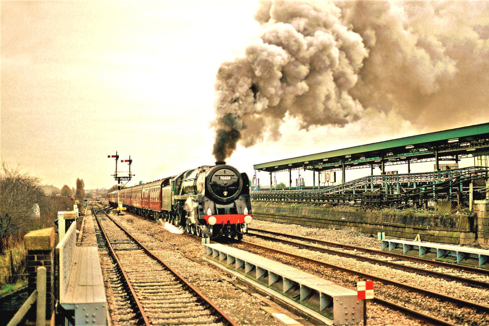 BR Standard 'Britannia' Class 4-6-2 No70000 'Britannia' opens up now its 11 coach train has cleared the junction at Greenford West having started from Ealing Broadway. This was the 'William Shakespeare Express' to Stratford-upon-Avon and return, seen from the old platforms of the main line station at Greenford on Sun 20 Dec 1992.