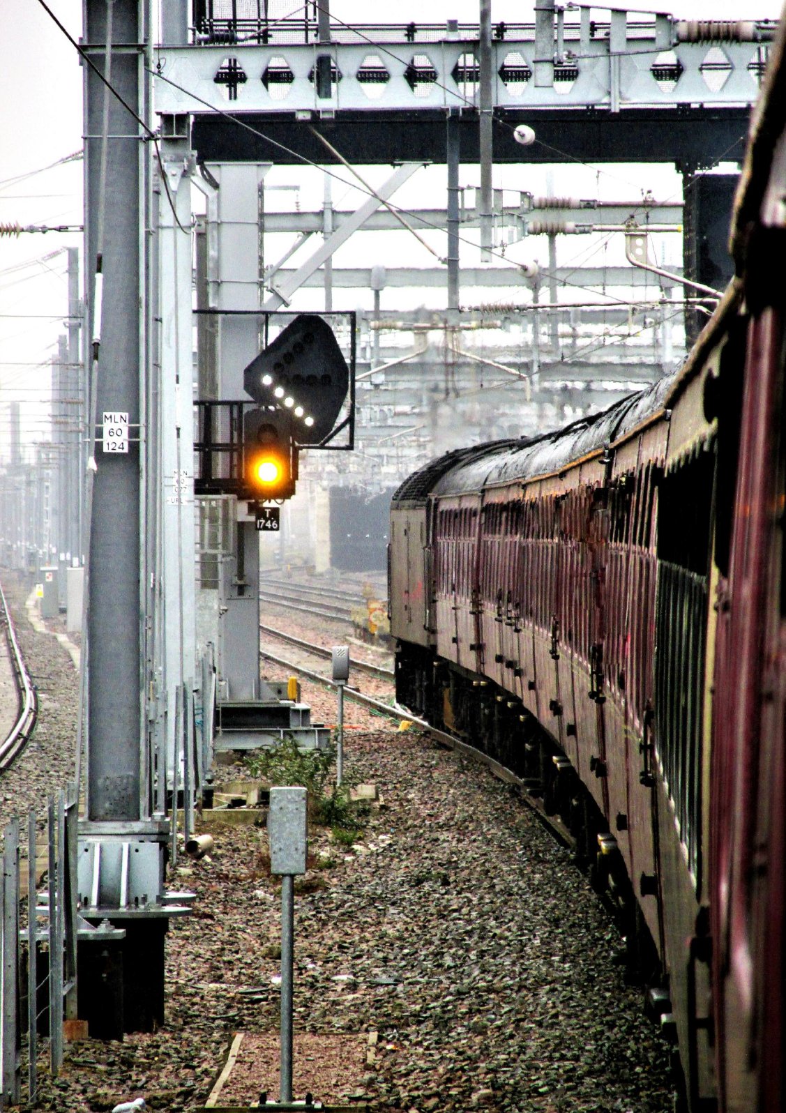 We departed on Line 6, which was then about to disappear in its previous form courtesy of Crossrail Christmas engineering works (it did indeed). Making use of the versatile bidirectional signalling here the tour switched to a new, indeed very new, layout at Portobello Jn (1m 33ch) where the previous installations had been demolished to make way for Crossrail. The infrastructure here was pristine, only commissioned a few days before (and refused during planning stages as it was not then in the system!). We were the first ever passenger train to use the new 'Crossrail Depot Line 1' and 'Crossrail Depot Line 2'. At Kensal Green East Jn we went left (2m 11ch) over the diamond crossover to Line 1 again passing the flyover line before joining it (Engine & Carriage Line) at the next diamond and then Reception Line 1 at Old Oak Common East!