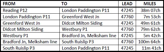 Maidenhead Up Relief (P4) and Twyford (P4 also) with attendant crossovers were covered in the Down direction before we entered Kennet Passenger Loop, distinguished by its 25mph restriction and jointed track. Kennet Bridge Jn was used to move from the Down Relief to Down Main and into Reading P8 (Down Main Loop). From here we traversed the bidirectional Down Reading Festival Line (named after the Reading Music Festival held in the fields on the Up side each August Bank Holiday - yes really!) to go beneath the Up and Down Main which pass overhead on the flyover (constructed as part of the £800M rebuild of Reading station and its environs). Before we could continue on to the Down Relief, the 10.00 intermodal working from Southampton Maritime Container Terminal to Daventry (six minutes late) was given priority on to the Down Relief off Reading West curve, but our delay was only two minutes. Once on the move it was yet more crossovers (hope you are keeping a tally - there will be a test later) switching from Down Relief to Down Main at Tilehurst East Jn and back to the Down Relief at Didcot East Jn then via Didcot Parkway P3 to reverse in Milton Siding (MP 54½). Interestingly there was a possession on the main lines from here to Swindon so we were the only train.