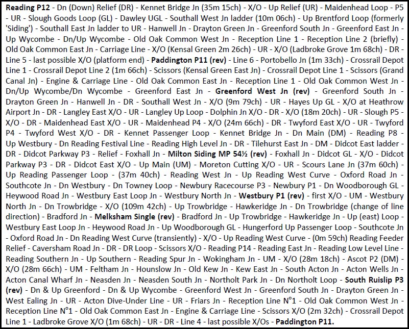 Park Royal and Greenford West Jn were next to reverse for the curve to Greenford South Jn, then Drayton Green Jn and Hanwell Jn (so cleverly covering that curve in both directions). The GW main line was followed for a straightforward journey to Reading with a couple of booked 'weaves' thrown in for good measure. In the event there was even more. The stone train at the Tarmac siding at Hayes had shunted clear of the two adjacent loops so it was now possible to traverse the Hayes Up Goods Loop in the rarer Down direction, then through Hayes & Harlington P4 to regain the Down Relief via the crossover within the Heathrow Airport Jn complex (and complex it certainly is now!). During an earlier iteration of this junction, this crossover was used by Heathrow Connect services but in the opposite direction off the Up Airport line. This is shown in the current (Aug 2010) TRACKmaps but overtaken by changes.