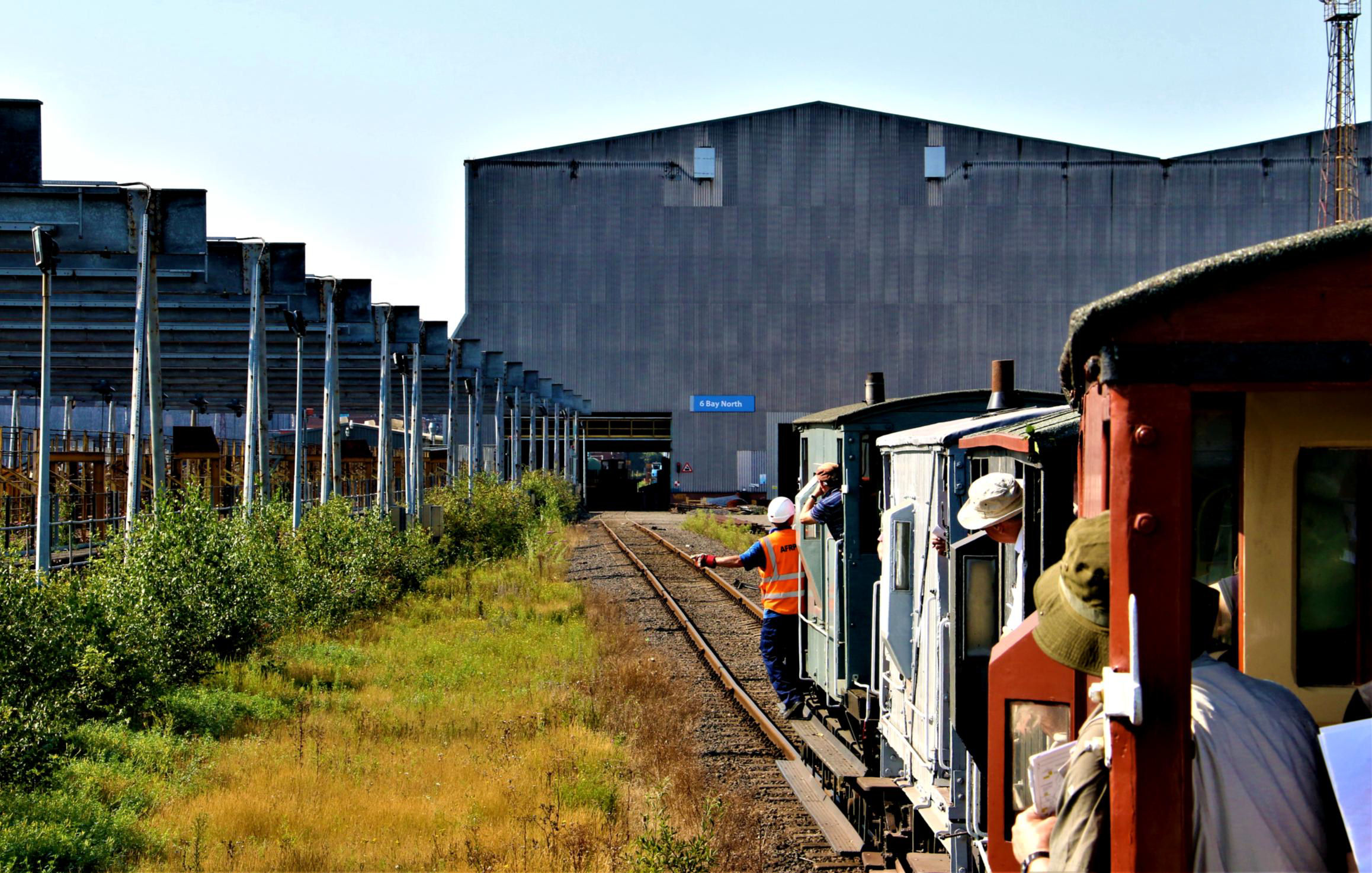 Setting off, news came that a TPE train bringing tour participants had started from Sheffield instead of Manchester (the first time this had happened). Our organiser decided we would return to the platform to collect them off the next train. That still allowed time for a visit to the CEW Dock which was much clearer than usual, and to the end of its headshunt, overlooking the Heavy Repair Bay (HRB) and some lines at the rear of the HRB itself. This was where our newcomers got to enjoy the magical experience of that first Scunthorpe Kiss when we gently nudged the buffers at the end of a cute little siding behind the bike sheds HRB. Even a few of the grizzled veterans shed a tear. Four of the eight northeastern end HRB lines were traversed and the Pig Castor Stay Road was thrown in for good measure. [Thanks to our map man Martyn Brailsford, a marked up updated tour map is available on our website Archive.] A shock for many at this 'point' was the total disappearance of Scunthorpe Plate Mill (closed Oct 2015) -all demolished - leaving just Line 23 and a very large empty space drastically changing the landscape.