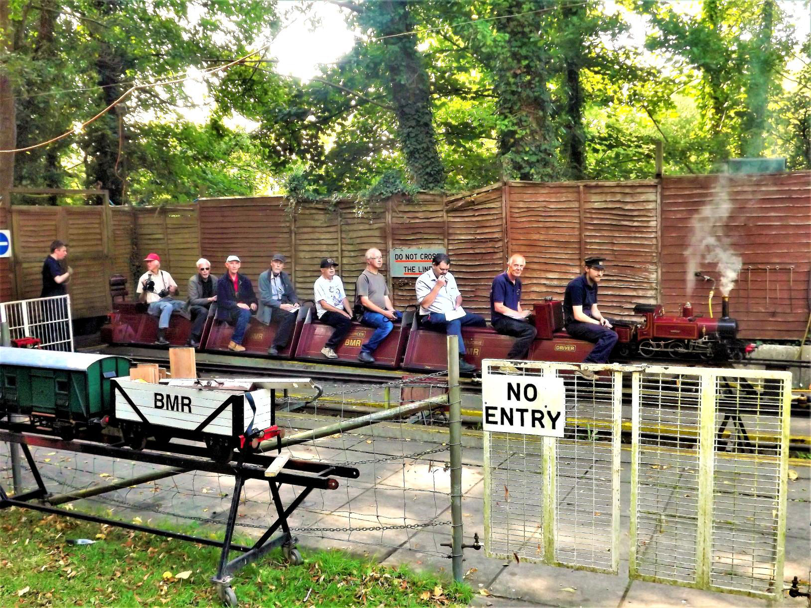 A bright sunny morning at Bursledon Brickworks Museum. The second half of our group has boarded the train at the level crossing on the Mineral Railway for the tour. Our 'outgoing' Membership secretary, Alan Welsh, is furthest from camera in the trio to the left.