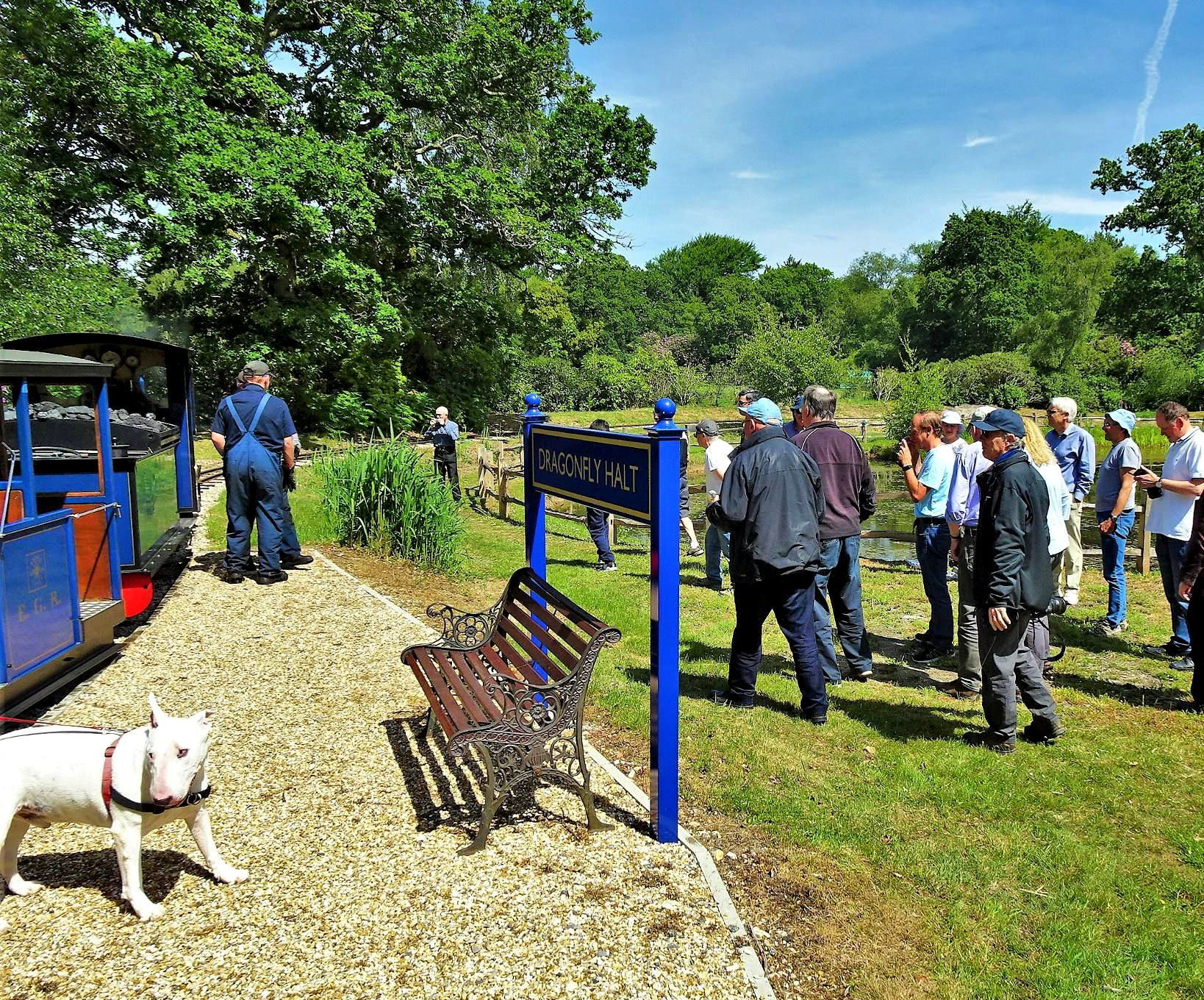 The train stopped at the not yet open Dragonfly Halt. Here the gravel platform (on the right in this clockwise direction of travel) was complete and had two Exbury Steam Railway style running in boards. A photo stop followed. The party was told that opening was pending revised insurance arrangements required by the deep water of the adjacent Dragonfly Pond which is fenced all the way round. It didn't look very deep to your reporter so maybe that is the issue!