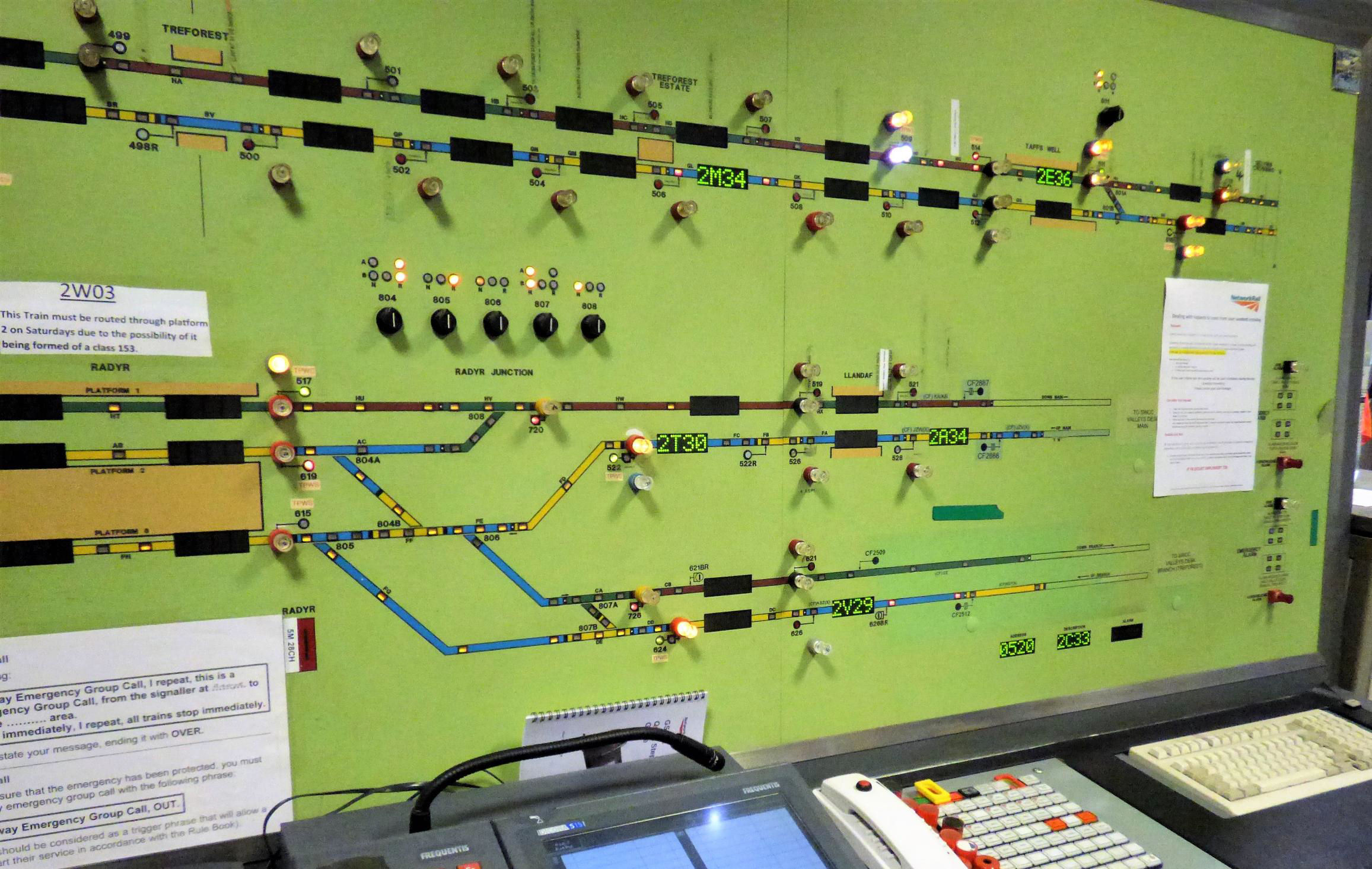 When Abercynon SCC first opened, it retained a small Individual Function Switch Panel dating from 1977 controlling the Stormstown area. This had originally been housed in the Abercynon mechanical signal box. In 2013 this panel was abolished and its area incorporated into Abercynon's Westcad system, however we were able to view the old IFS panel behind the work desk.