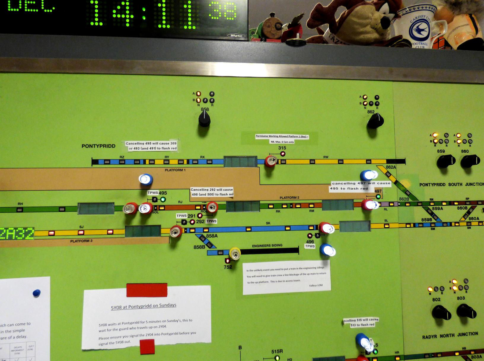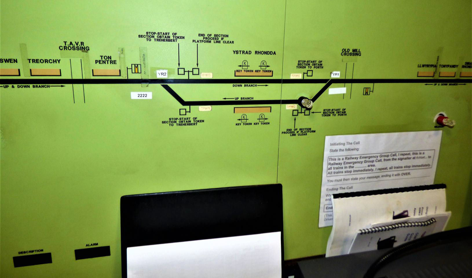 Drivers obtain a token by phoning the Radyr signaller, who presses a button on the panel, releasing the instrument which allows a token to be removed. For convenience, token instruments are provided on both platforms at Porth and Ystrad Rhondda, leading to a token imbalance (some instruments are normally used only to remove tokens, but they are normally returned to the corresponding instrument on the opposite platform). To correct this a Mobile Operations Manager visits each evening to transfer tokens from one instrument to another. [Hopefully they receive more than a token payment for this.]