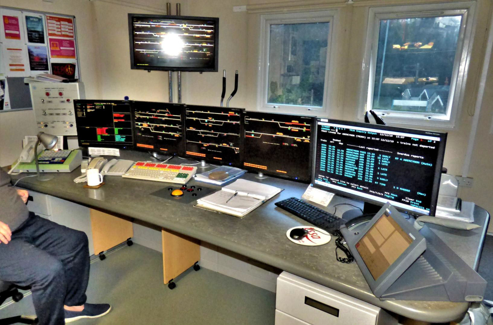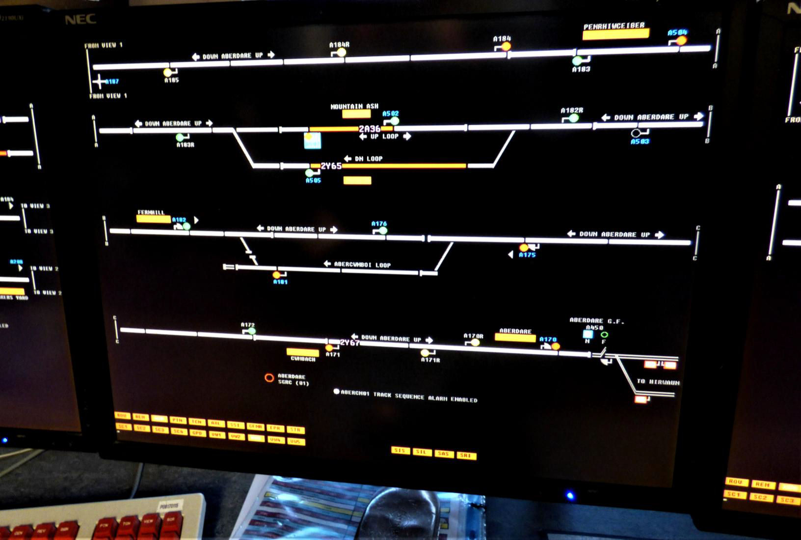 We were also shown photographs of seven former mechanical signal boxes in the area now controlled by Radyr Junction Panel. After a short train ride or car move, we reconvened at Abercynon to visit Abercynon Signalling Control Centre (SCC). From the station car park, we could admire the former Abercynon loco shed (BR code 88E), now a warehouse. The SCC dates from 2008 and is also a portable building, this time two storeys high. It is built on the *Down side of the line opposite the site of the former mechanical box that once stood on the island platform. The box uses the Westcad VDU and Trackerball system to control the line from MP 14½ south of Stormstown Jn to the south, where it fringes with Radyr Junction panel, and the branches to Merthyr Tydfil and Aberdare (and on to Tower Colliery) in the north. A peculiarity on the Aberdare branch is that drivers need to report their arrival at Aberdare, and request line clearance for the return journey. This is because Cwmbach Sidings User Worked Crossing is situated before the first stop signal in the Down direction from Aberdare.