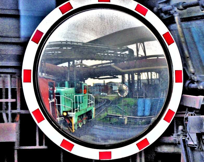 Not a porthole but a photo of a level crossing safety mirror (that could do with a good clean) reflecting No1 propelling four brakevans over Queens's Approach Road Level Crossing. This was while visiting Queen Victoria's bottom shunting between the two roads - 115 points.
