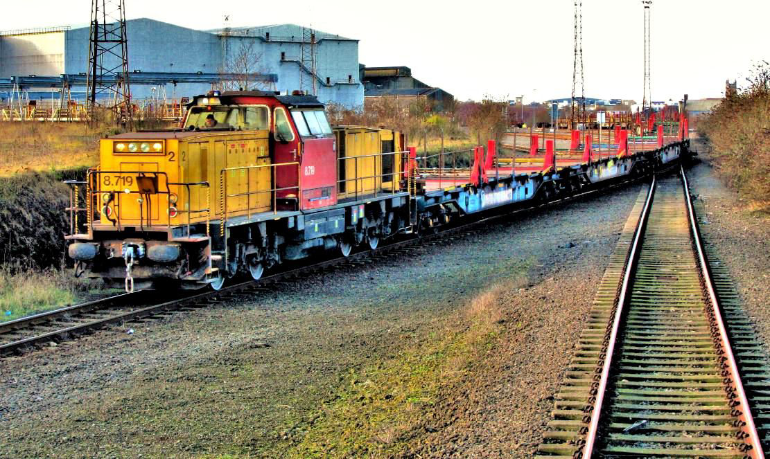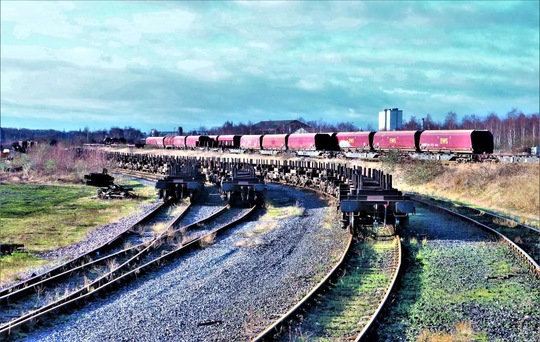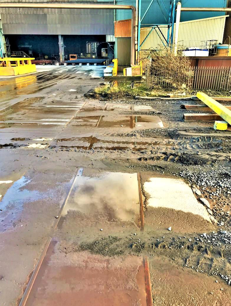 Earlier a Di8 Norwegian loco hauled a long rake of rail wagons out of the Rail Service Centre Road 5; it is on the connecting line sloping down to Dawes Lane and the rest of the steel works. Taken from our tour which is on the Rail Service Centre east head shunt end of line. It was at this point that it was decided to make for Road 5 before another train appeared with wagons to reoccupy it…