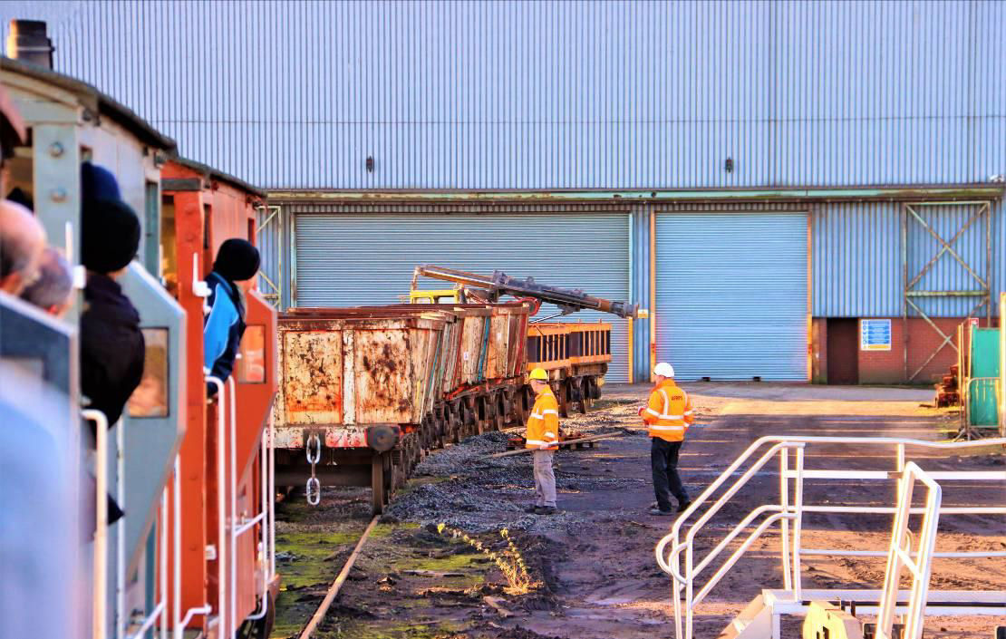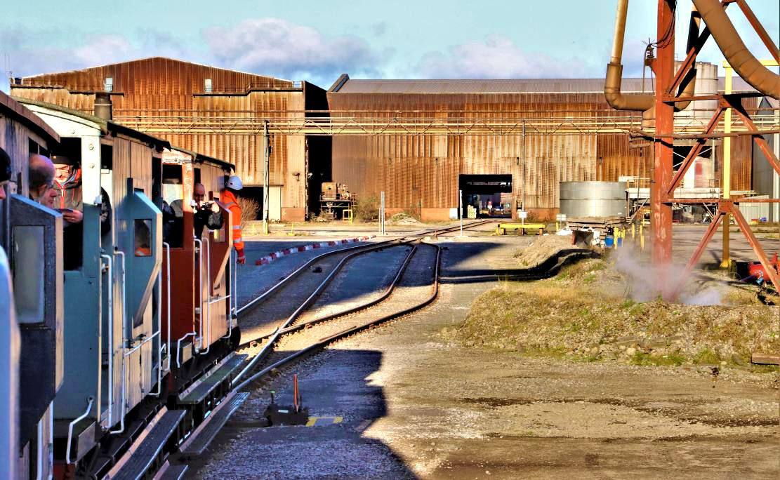 The day dawned bright and sunny at Frodingham platform with not a cloud in the sky - that is until a quenching operation at the coke ovens produced clouds of steam; once a common sight, it is becoming an endangered species. Our 'ECS' arrived slightly late and in reverse formation, but I still went for a heated brake van in the middle. The aim of these railtours is to cover as much track as possible and go to the extremities of the lines; there is over 100 miles of standard gauge at this vast nearly 20,000 acre site. In true tradition departure was towards the nearest buffer stops at the loop headshunt! Back to the other end of the loop for a reversal and through the loop to the headshunt again for overlap and only then did the tour leave the station area in search of track to scratch. The train comprised four brake vans (BR 20t Standards 7605, 955160, 'Shark' 993829 [unheated] and LMS 20t 295516) with over 80 people on board. All seemed to have received either a new red biro or highlighter pen for Christmas and were very eager to use them. Motive power was Yorkshire Engine Co 0-6-0 DH No1 YE 2877/1963.
