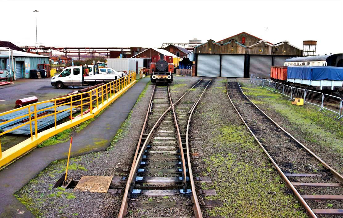 Just before entering Rail Service Centre No5 Bay. The klaxon warning system has been activated hence the green light left of the triangular train sign on the building. A bit of 'impossible track' is to the left and left of that at the front is AFRPS member and accredited shunter-in-chief, Alan Sheppard our member, Scunthorpe expert and route director.