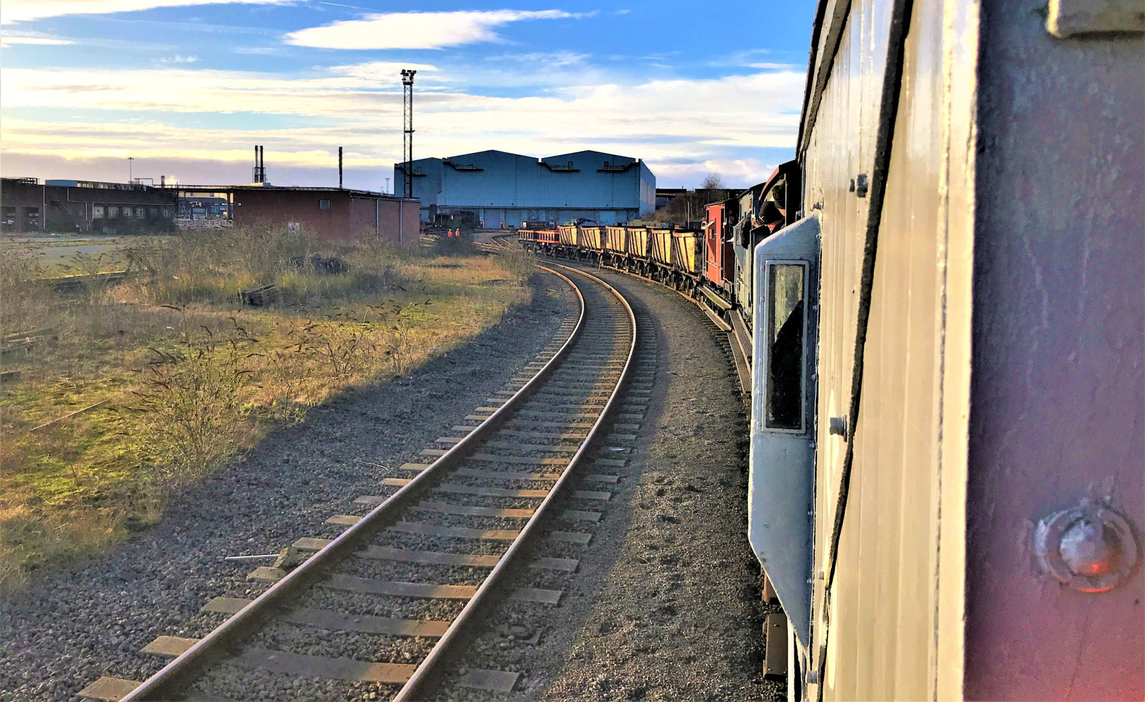 There were two possible ways back to the platform, so which way would the BLS choose? No contest really, so off we set round the perimeter line again with the sun setting in the west. Past the gaggle of Di8s in Mills Exchange Sidings, down the long straight then by the Slab Yard, round the end of the BOS Plant and on the outer line back to Bridge 44, two tracks over from where we had been earlier.
