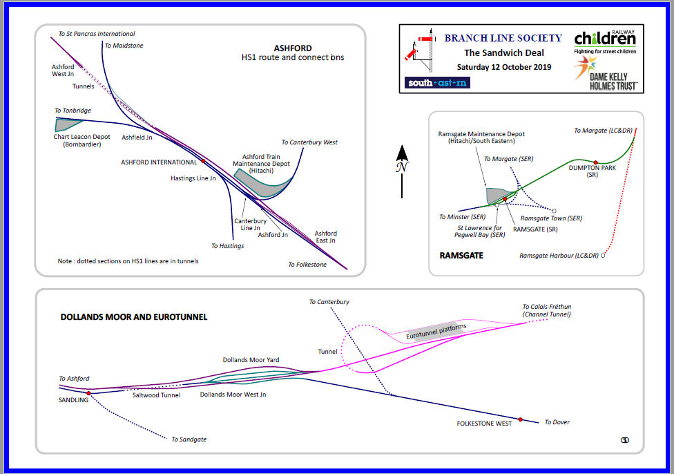 Now 1Z21 the tour set off on time for Ashford International completing Margate P2, which I am told is only normally used by trains turning back from the Faversham direction. The coffee tasted nice. After passing through Ramsgate P2, then taking the second crossover onto the Up Stour, a run to Sandwich and Deal was eschewed in favour of running directly to Canterbury West from Minster East Jn. The remains of Chislet (Colliery Halt) Southern Railway style concrete platforms (CP 4 Oct 1971) were noted at 74m 57ch. Some people had hoped to red pen the Up Siding at Canterbury West but this is out of use, so the main line was taken to Ashford International where this leg of the railtour finished.