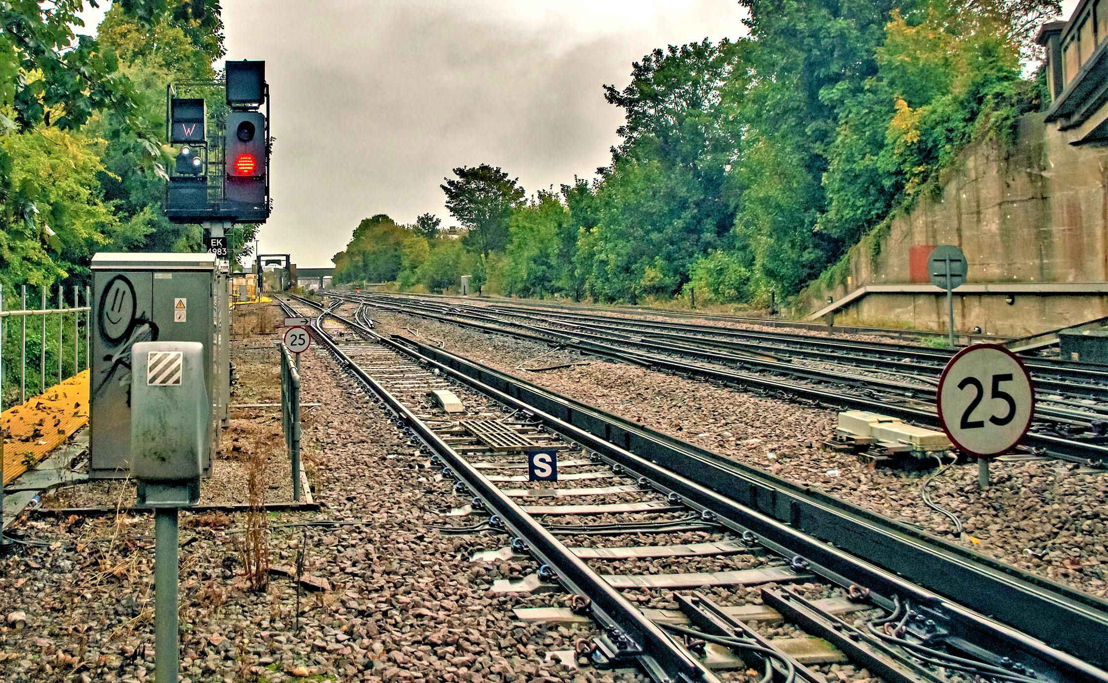 The other way towards Ramsgate station from the Depot Reception West line; the shunt signal is 'off' and 'W' is for Wash Road.