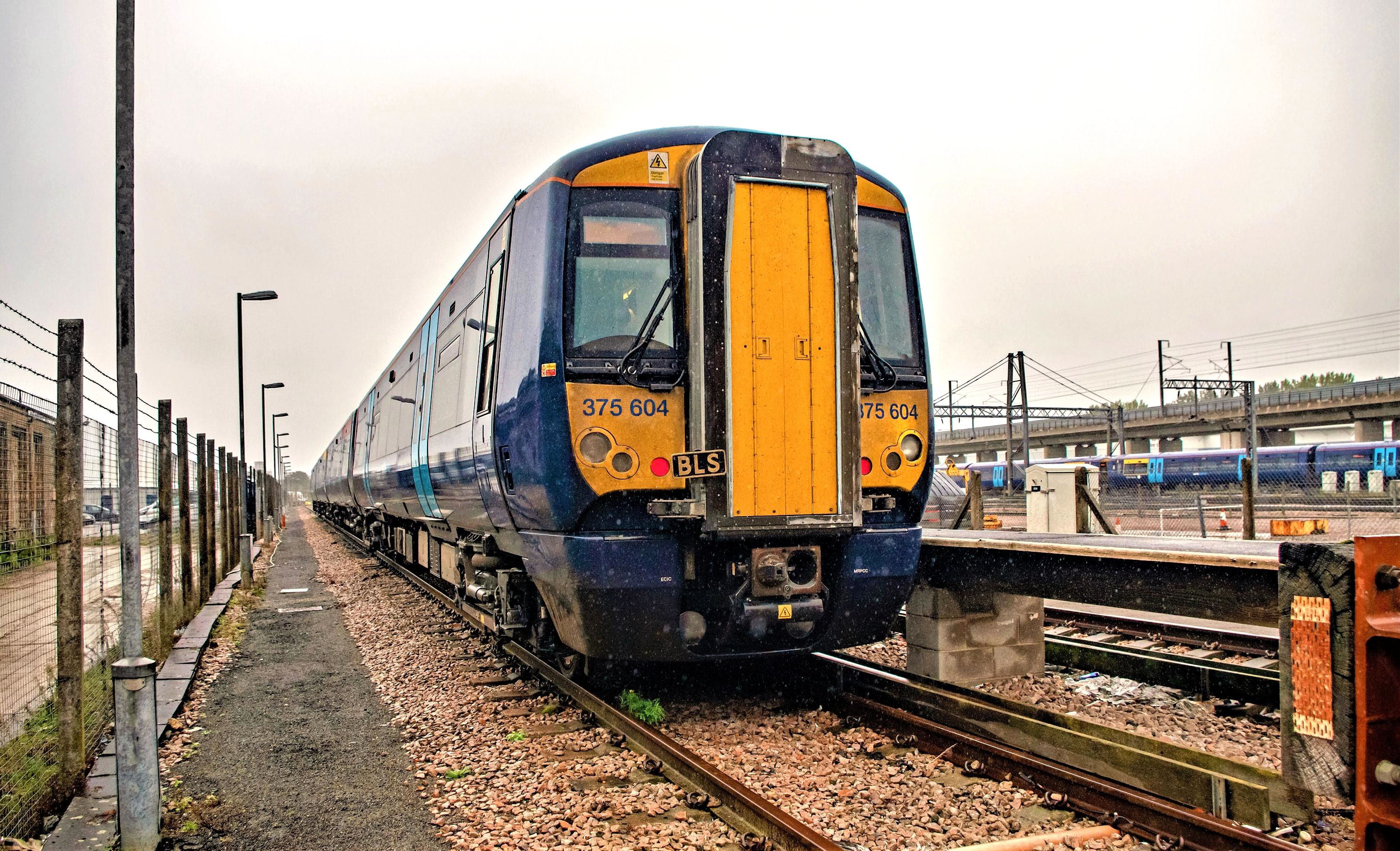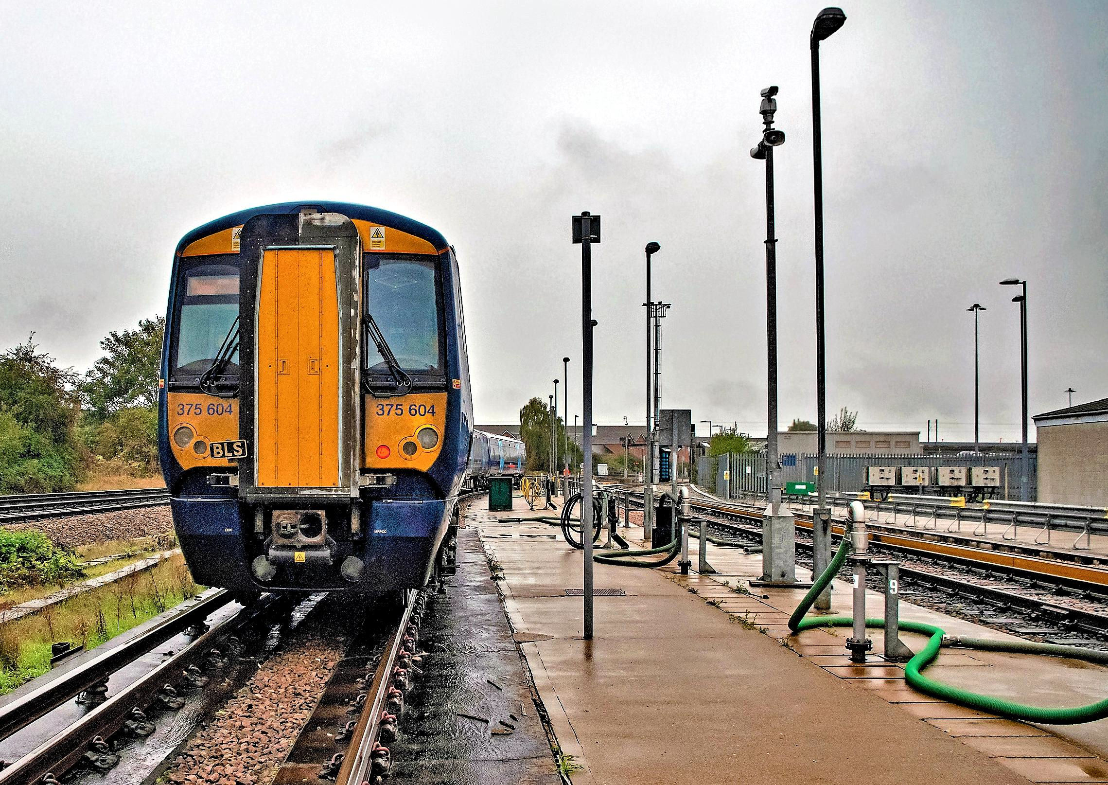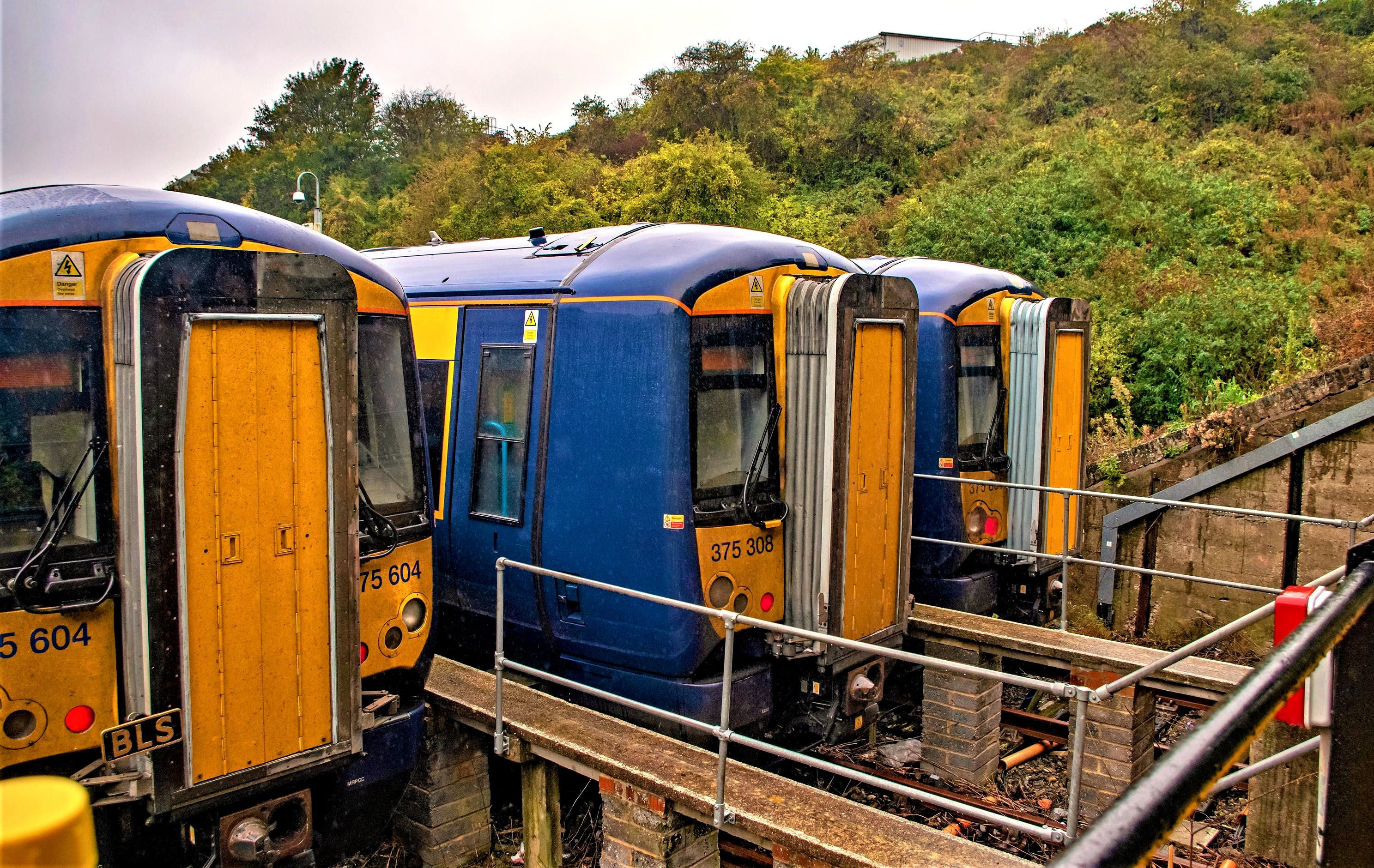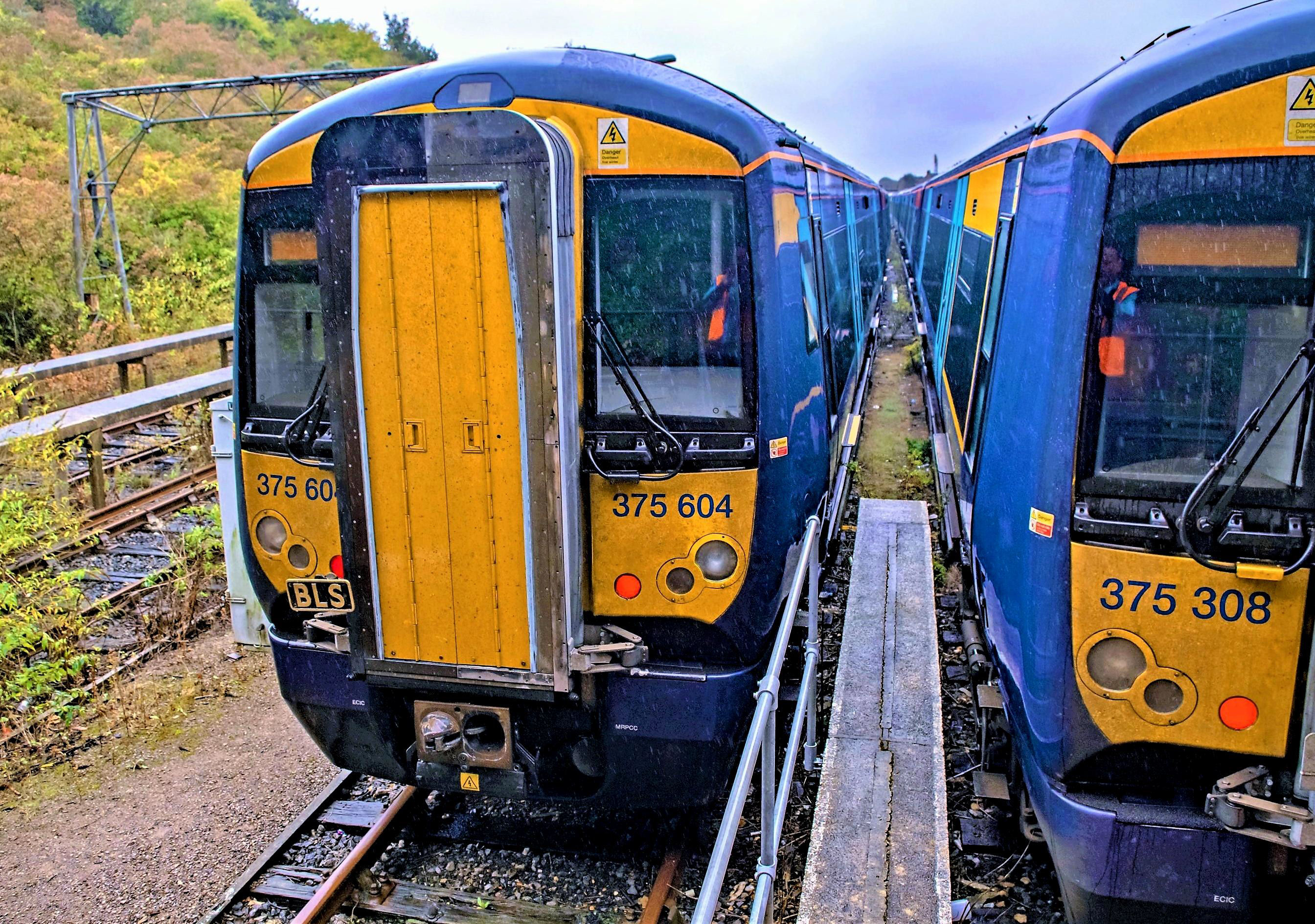 In pouring rain our tour (left) is in Train Road 3 at Folkestone East, the three Berthing Siddings are left; 375308 is in Train Road 3.