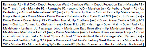 The pièce de résistance was up next. Ashford Down Yard Berthing Siding 12 gricing the Biohazard Cleaning Pit (56m 47ch from Charing Cross via Chelsfield) with a double reversal on Ashford Depot (washer) Bypass Road by the 4-car stop board and Road 12 itself. Having served up this choice offering, we headed back to Ramsgate as 1Z26, exiting Ashford Depot by the Canterbury end Down Yard East Jn. There was still time for a few more morsels, a run behind Canterbury West P2 along the Down Loop and a mazy weave through Minster to rake in the crossovers either side of bidirectional P2.