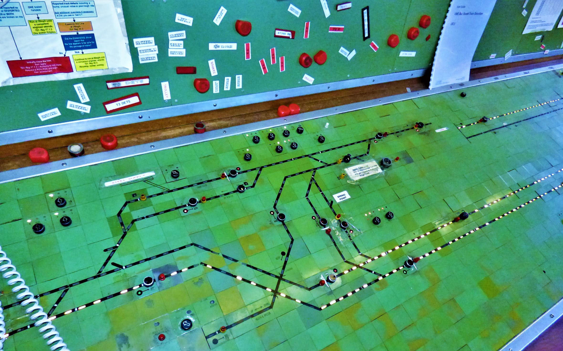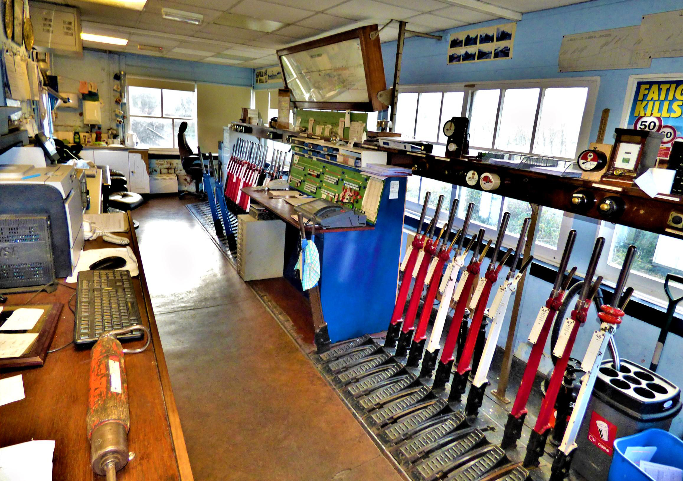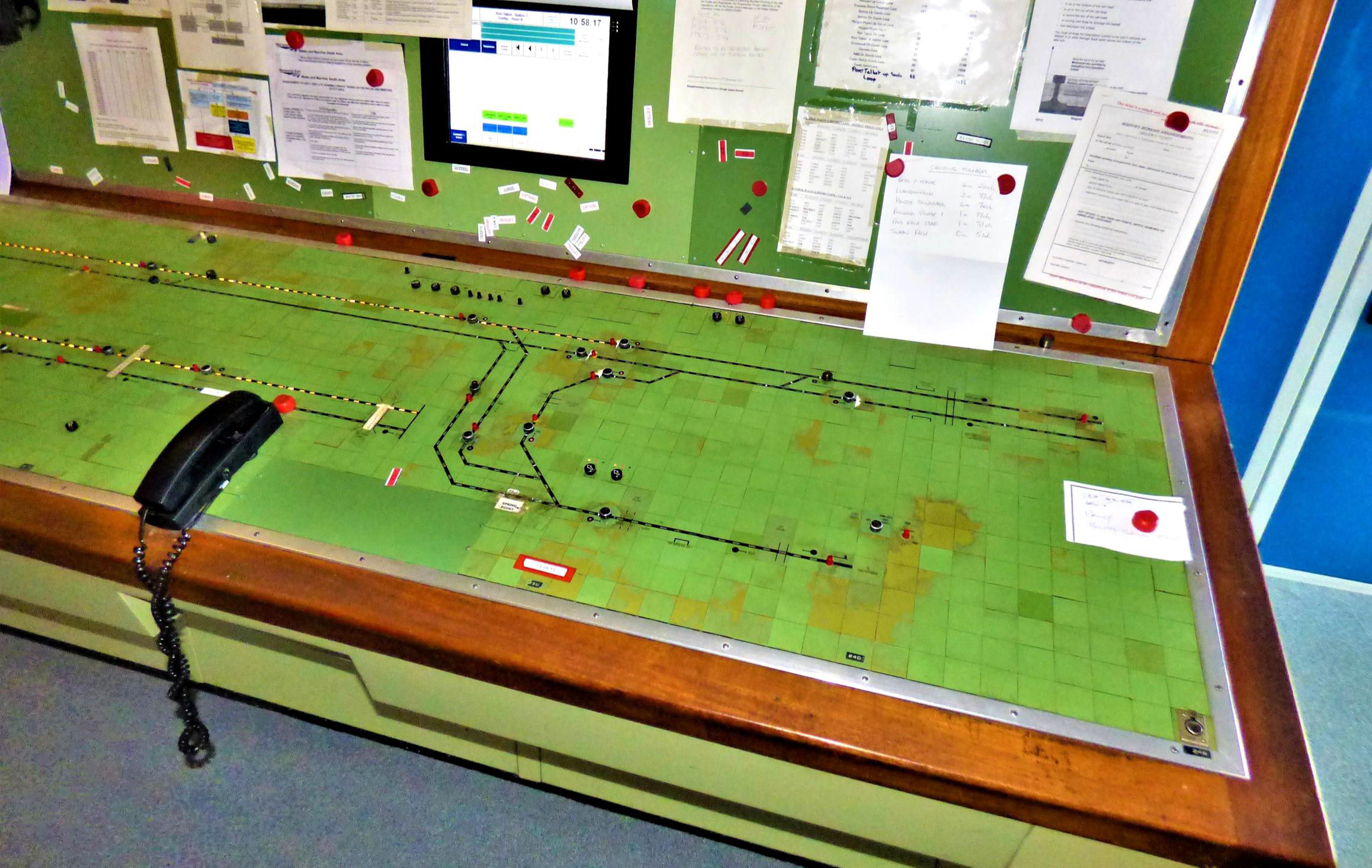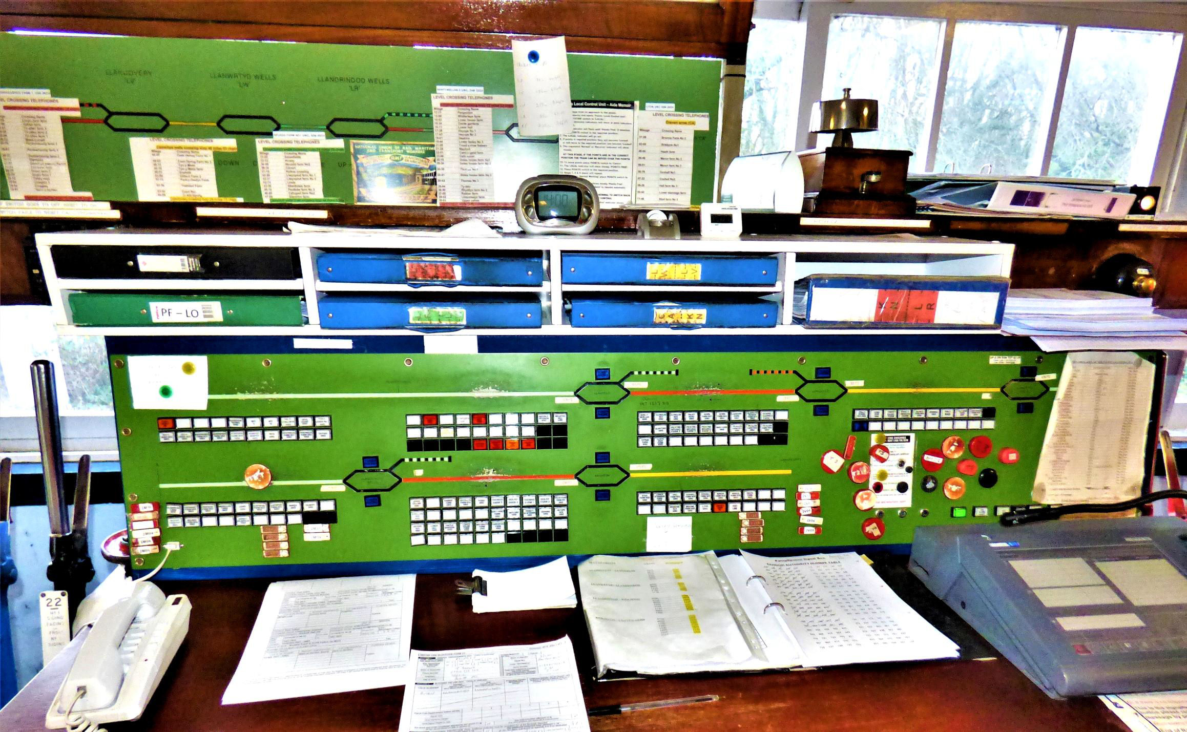 The centre of the frame is taken up with the impressive telephone concentrator and a representation of the line to Craven Arms. In addition to driver communications during the token exchanges, the concentrator supports the large number of user-worked level crossings along the line.