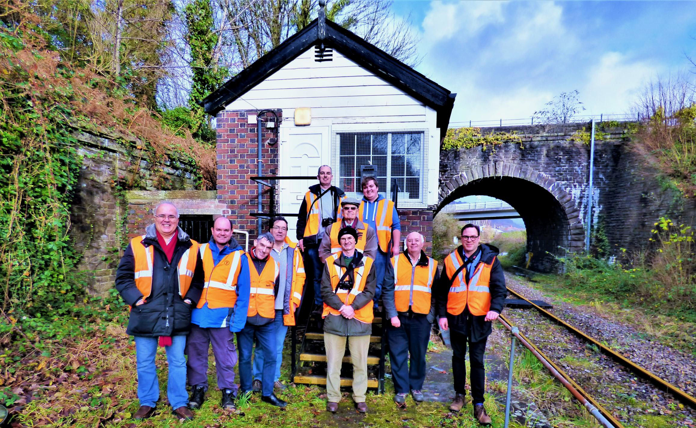 What time is the next train to Brecon, chaps? Looking at the track there hasn't been a train recently. A 'boxful' (collective noun) of signalling aficionados on Neath Riverside station platform with Neath & Brecon Junction signal box. The South Wales Main line is on the overbridge behind.