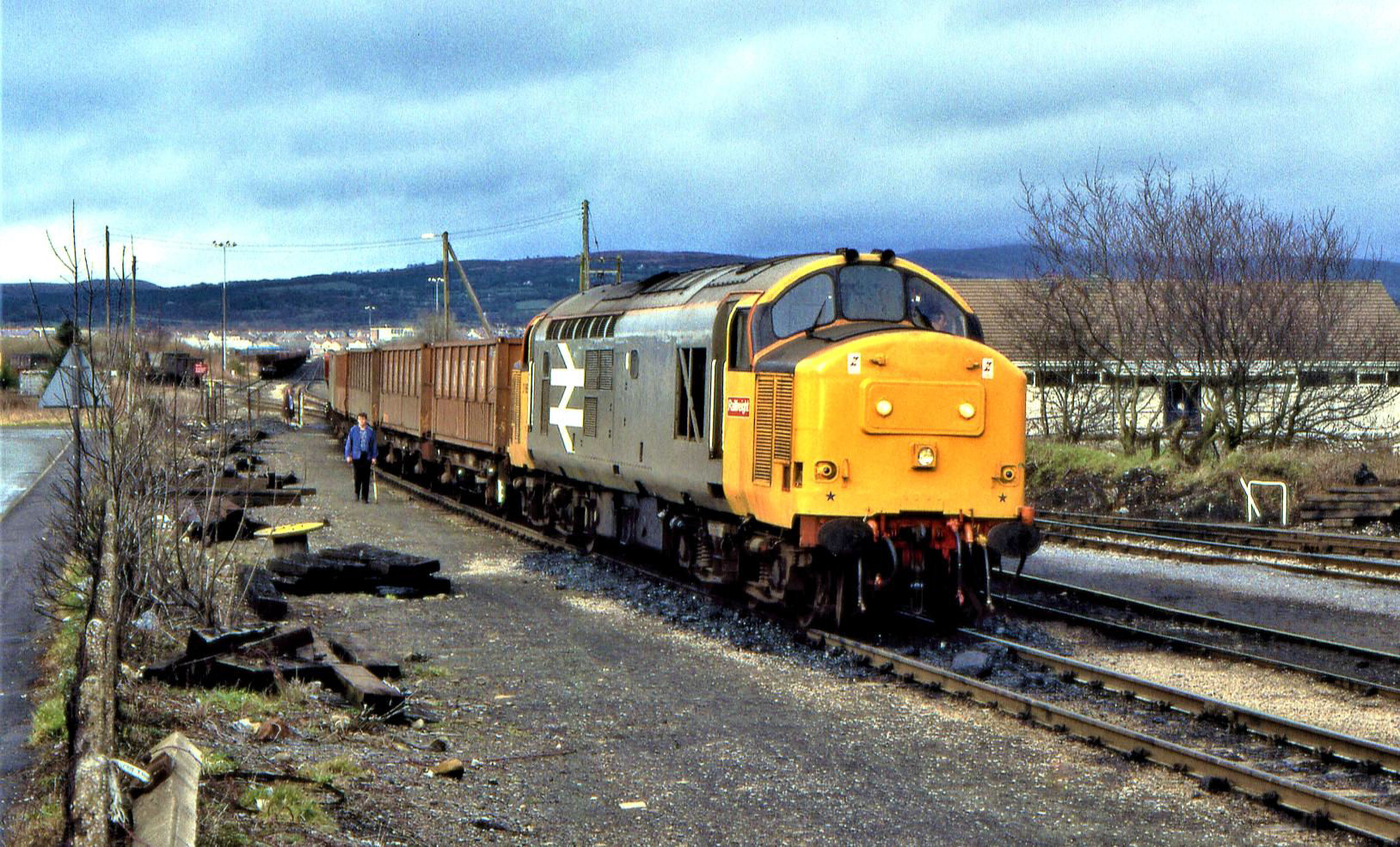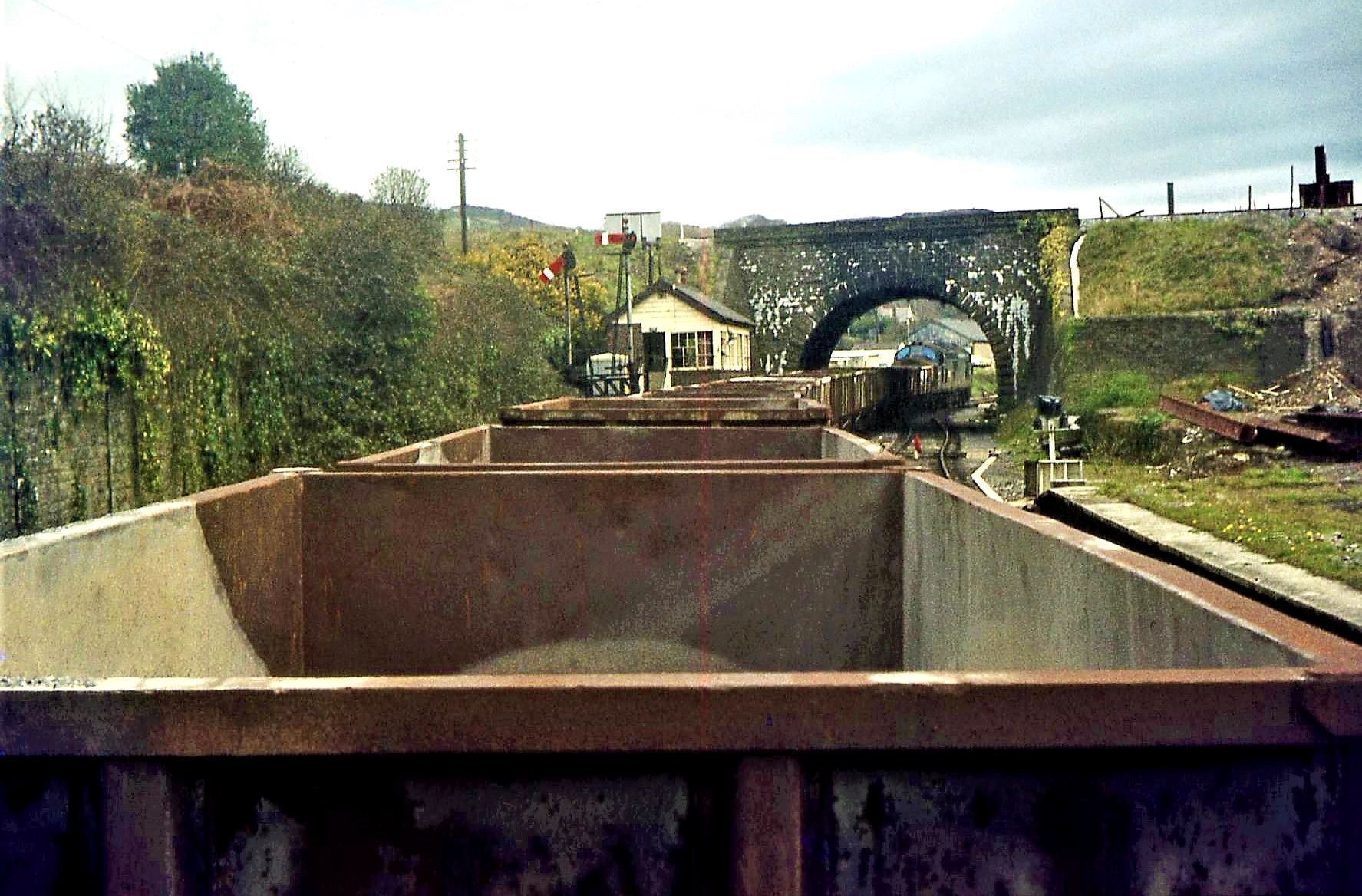 Pantyffynnon with more sidings; a coal train from Betws drift mine - off the GCG branch. The mine opened in Feb 1978, finally closing in Jul 2003 - BLN is a mine of information. (7 Mar 1988.)