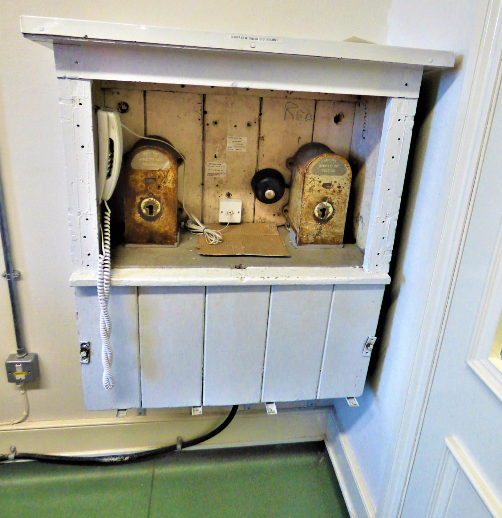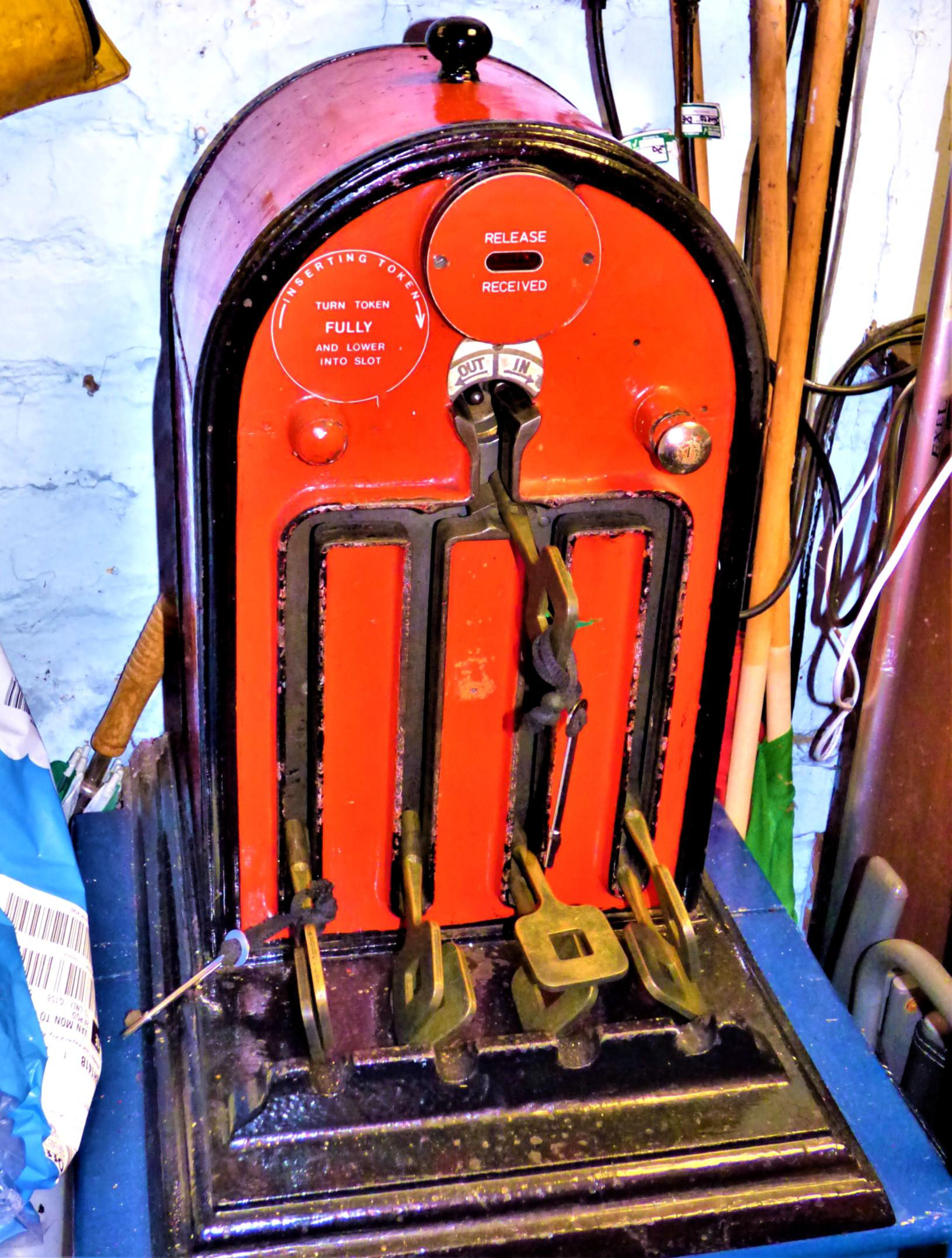 Back at Pantyffynnon Level Crossing: Annett's Key release (one for each gate) in the station building. When the level crossing gates are closed to road and open to rail both Keys have to be inserted here and are electrically locked in, to release the signals to be cleared for a train. The only way the crossing keeper can extract both keys from the two gate locks is by securing both gates to road traffic - this is portable interlocking, simple but effective and no risk of software failures!