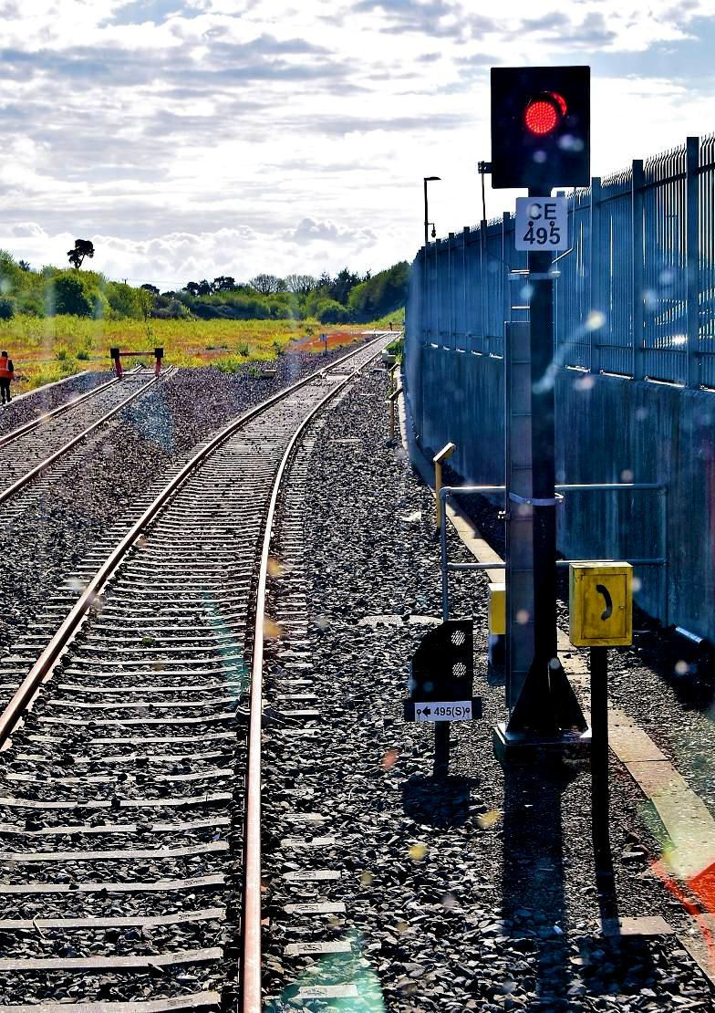 Taken through the unit's windscreen. The rarest track of the tour; the east (Youghal) end continuation beyond Midleton P1 which deviates right. The main signal is a fixed red but the Ground Position Signal is set for the tour to proceed, which it did. The 5' 3" broader standard gauge is evident.