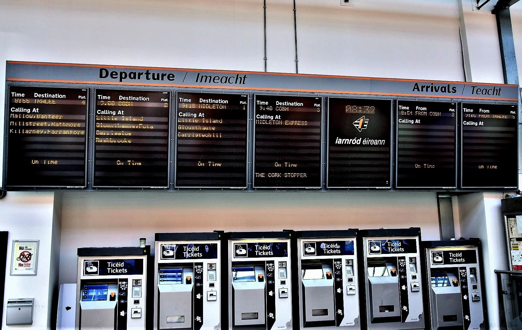 Something a bit different at Cork station (middle screen); an 09.40 to Cobh calling at 'Midleton Express' which was 'The Cork Stopper'...