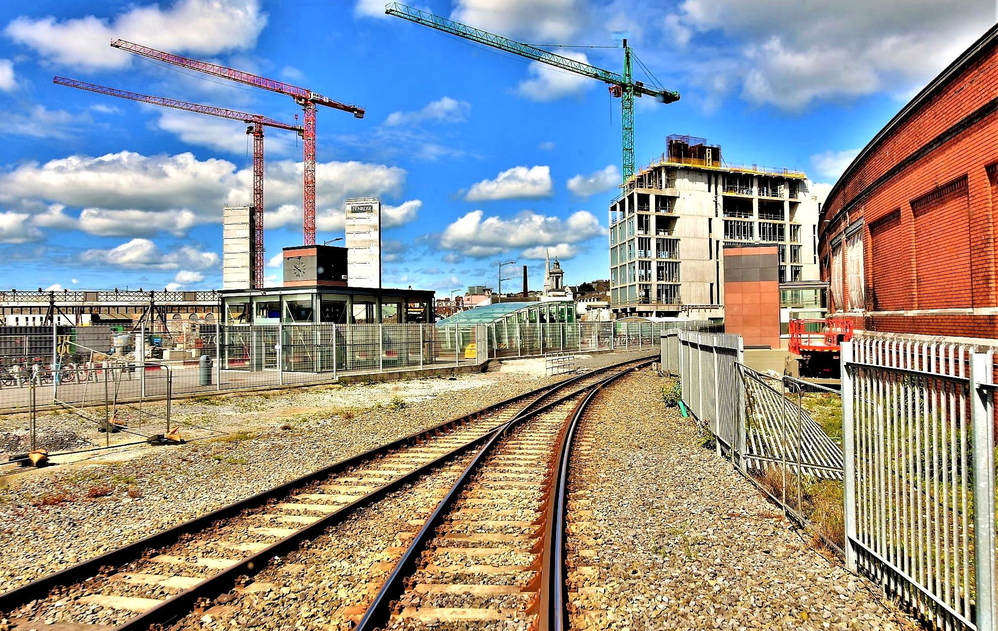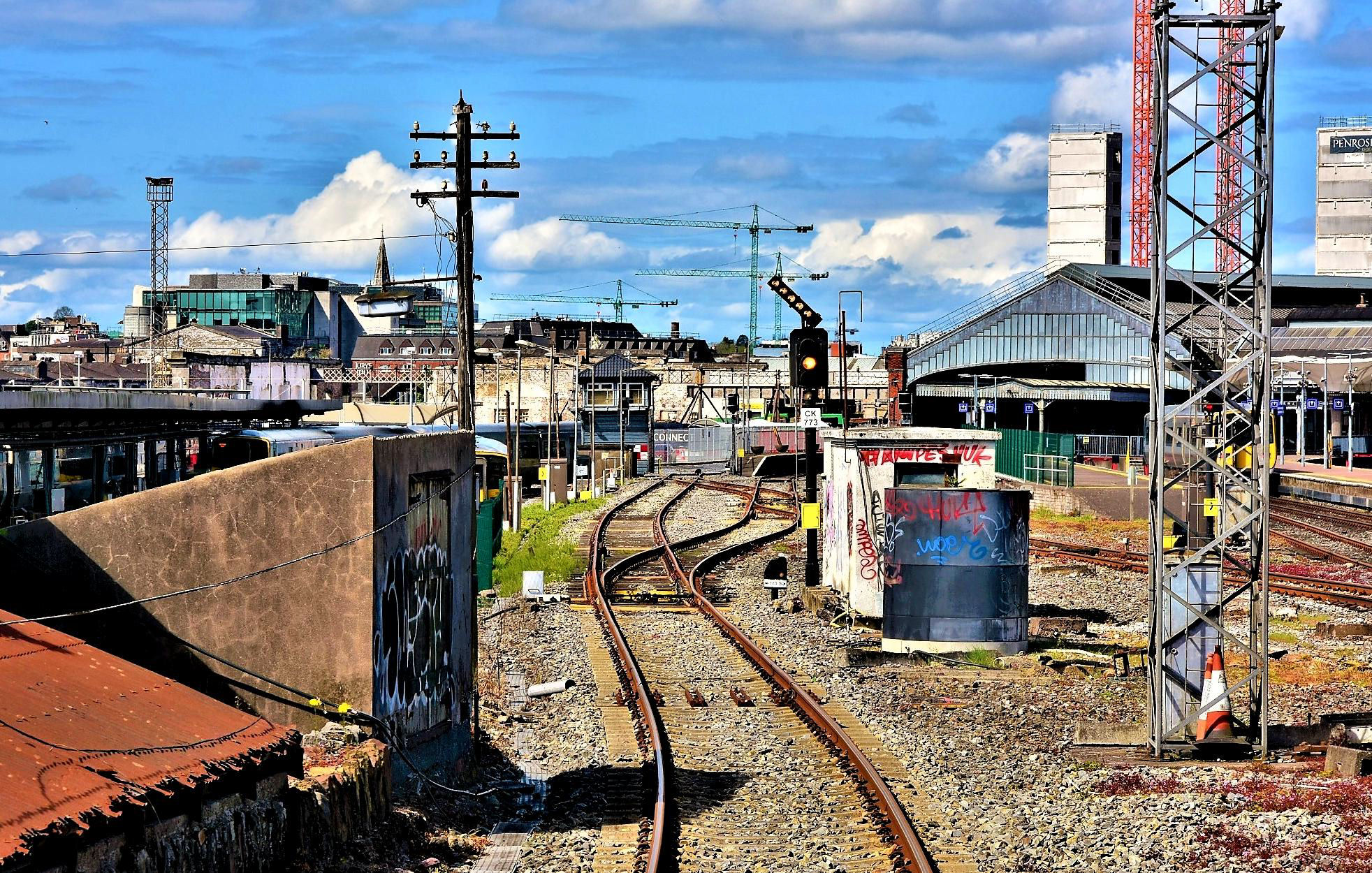 Approaching Cork P3 from Midleton, the 'crane count' shows the City was booming. The train on the right is in the Down Siding.