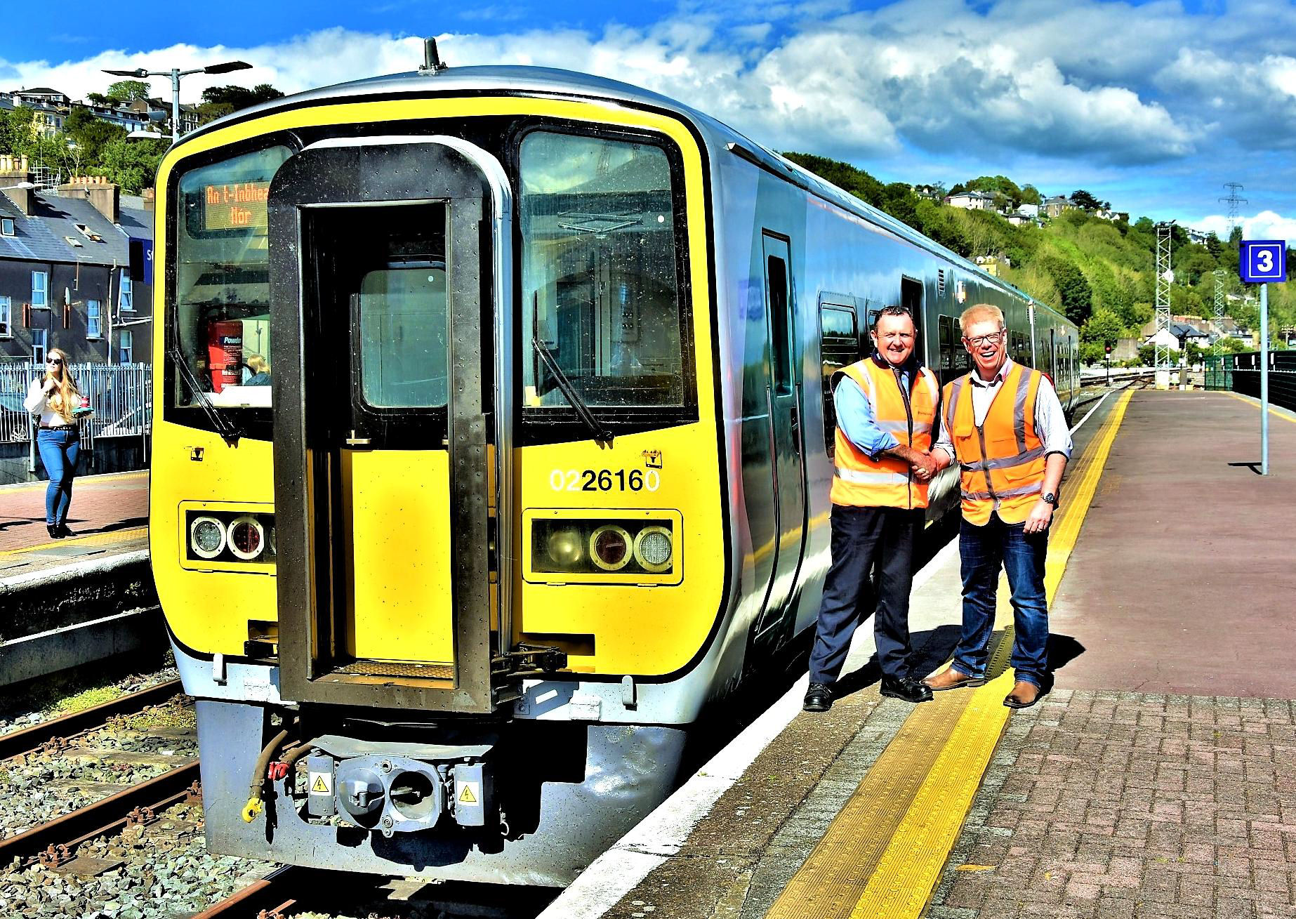 Two great enthusiasts at Cobh, our Kev Adlam on the left and Cork driver Ken Fox. The normal passenger train stop point is evident.