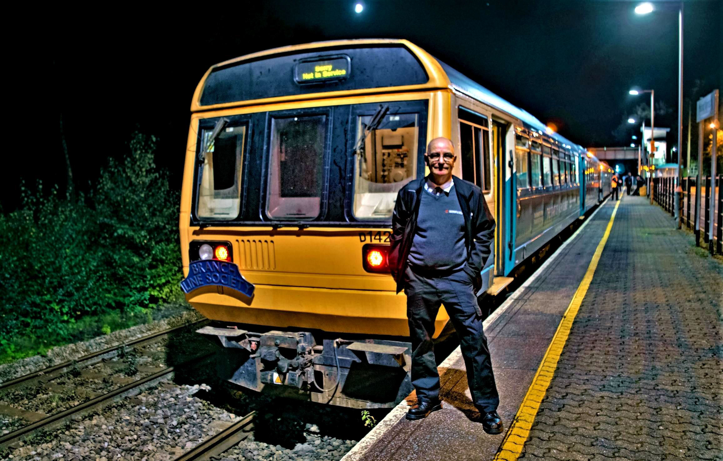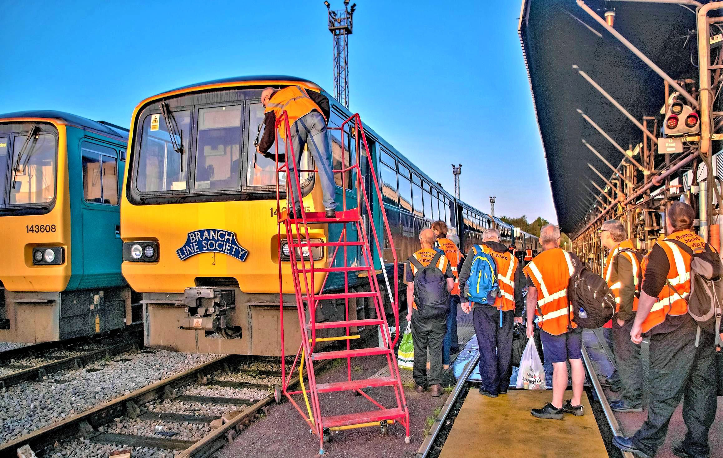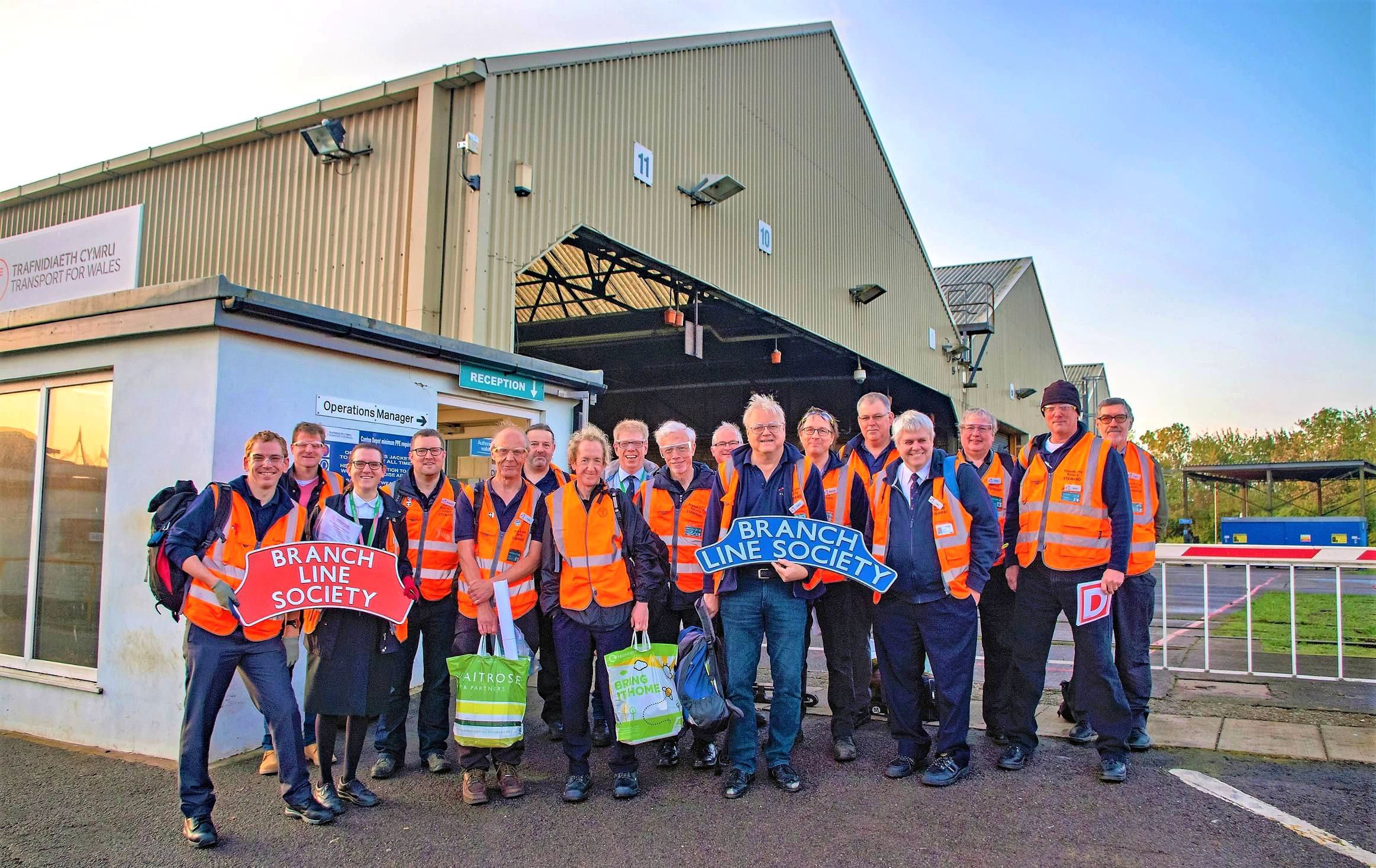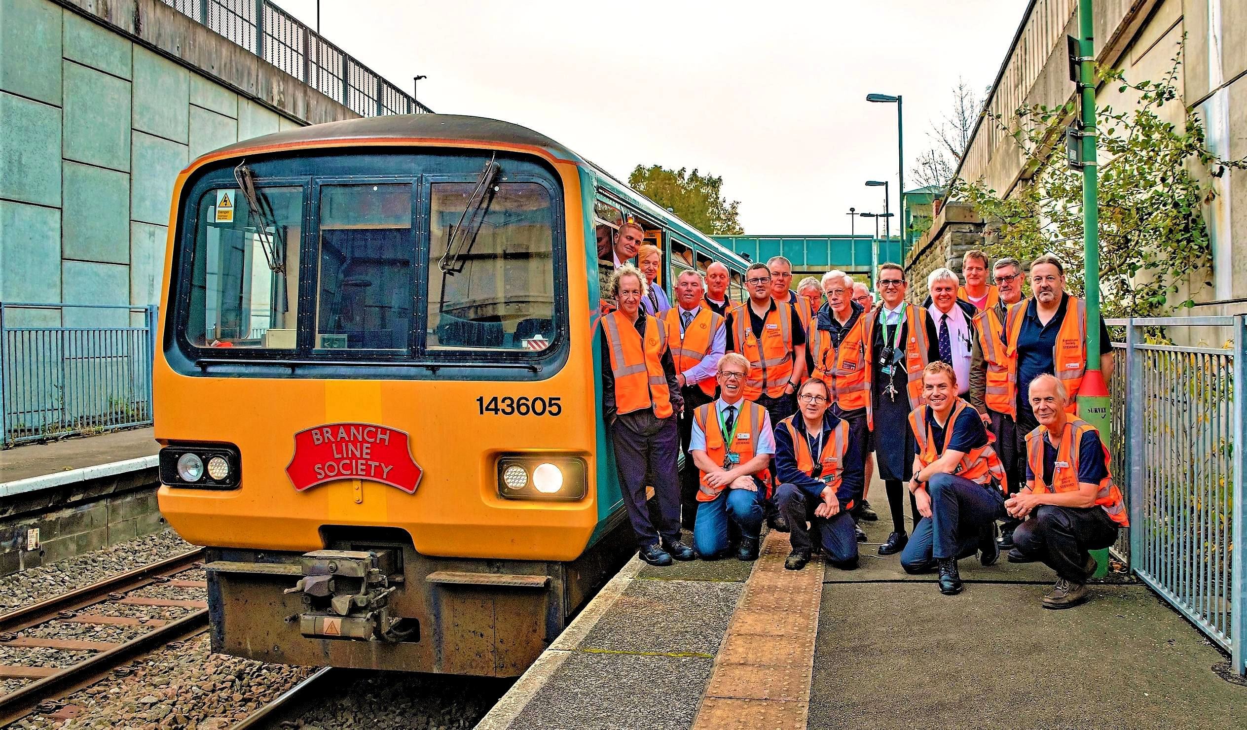 A sea of orange at Bargoed in the evening; David Clark (our Society Publicity Officer and TfW Senior Train Planner) is the slim one far left.