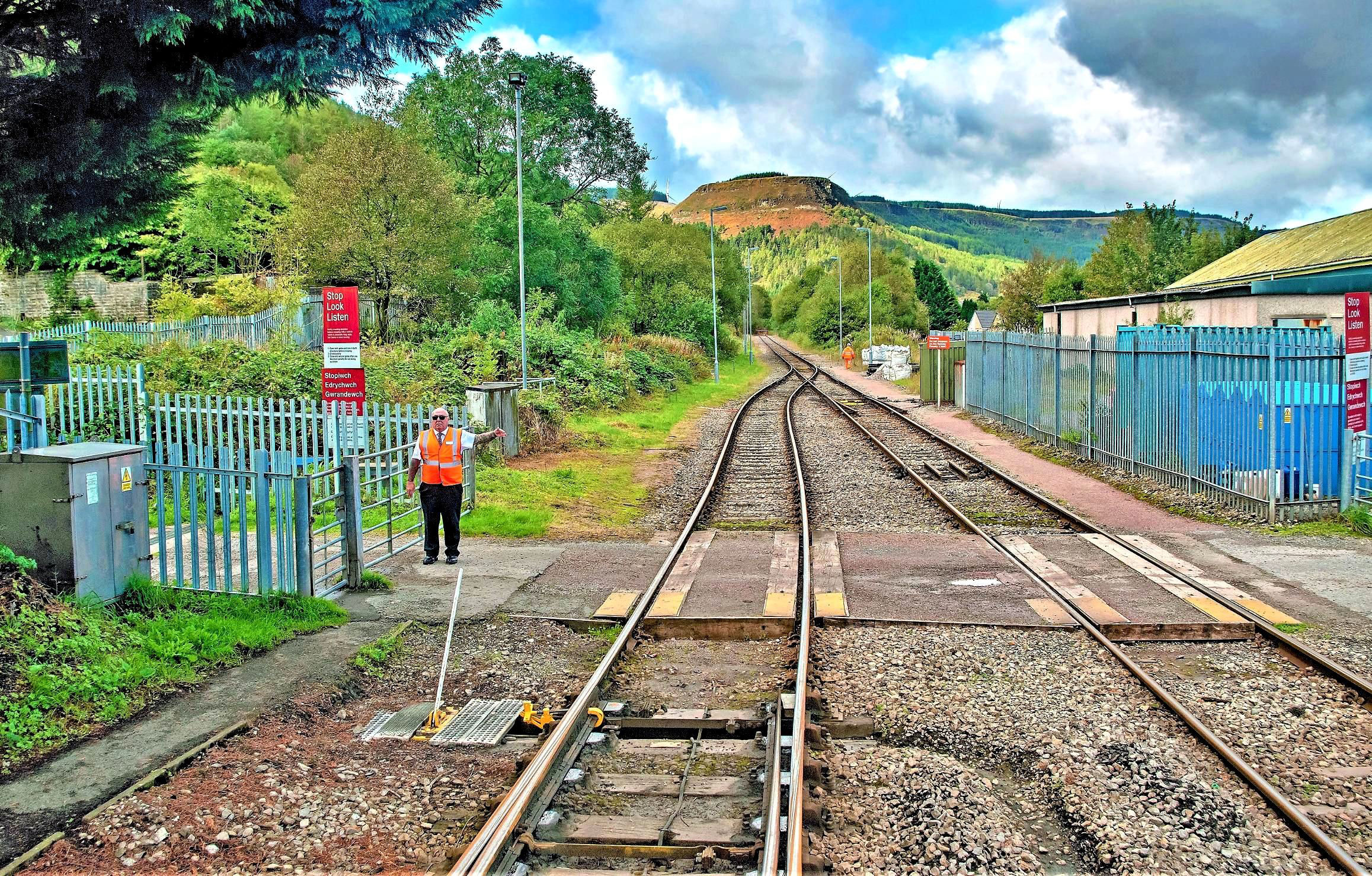 Treherbert the same day (on 4 Aug 2012 this line was shortened by 15ch). Note miniature headboard; the organiser, our Chairman John Williamson, is left in a high viz vest.