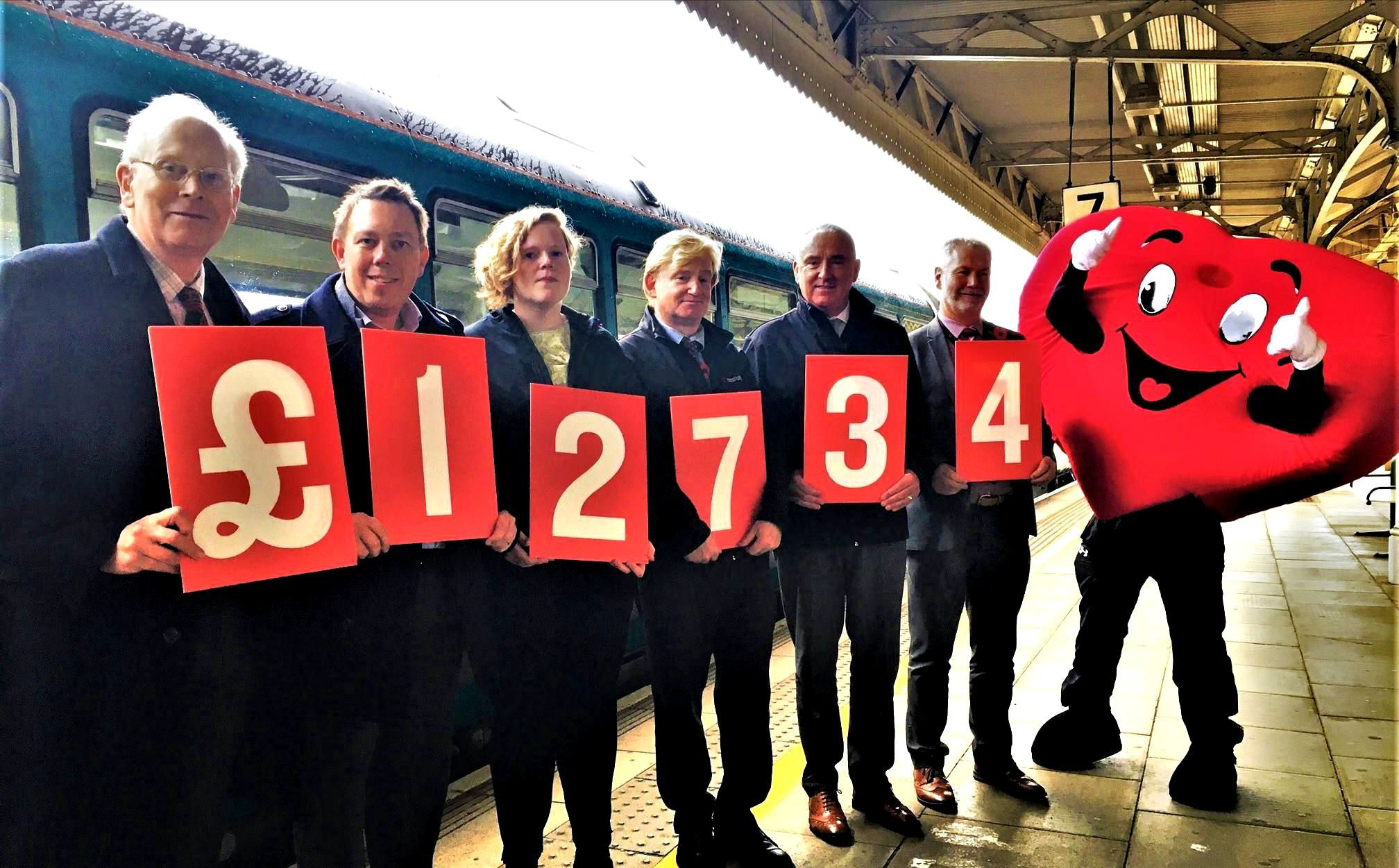 In far from ideal lighting, local member and previous Wales BLN Regional Editor, the late Paul Jeffries (far left) was very proud to represent the Society at the presentation of £12,734 to the British Heart Foundation at Cardiff Central on 6 Nov 2019 following our railtour. (BHF.)