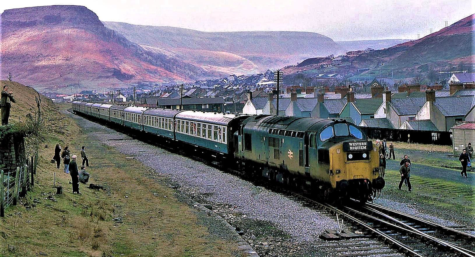 20 Feb 1977; Railway Pictorial Publications Western Requiem returning to Treherbert station from the headshunt after running round (the loop, behind the train, was also taken out of use 4 Aug 2012). The photographer had not realised that passengers could stay on for the run-round, but made up for it on 24 Jun 1984! In case you were wondering, the Western failed at Cardiff.
