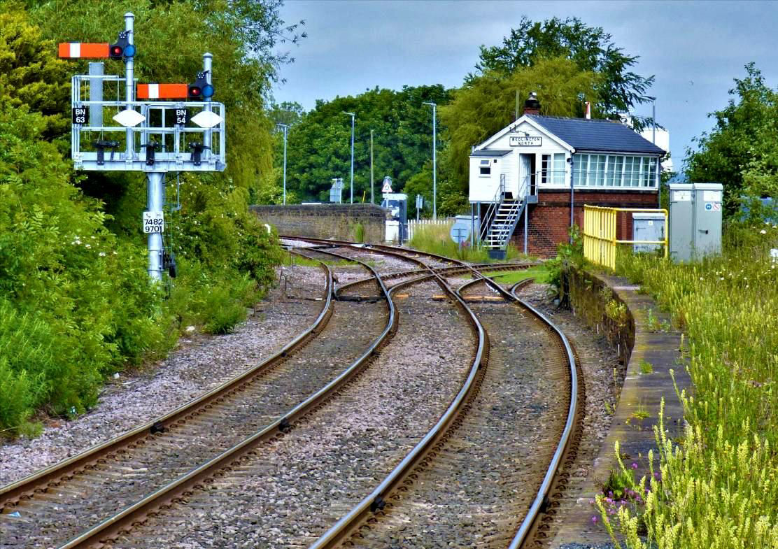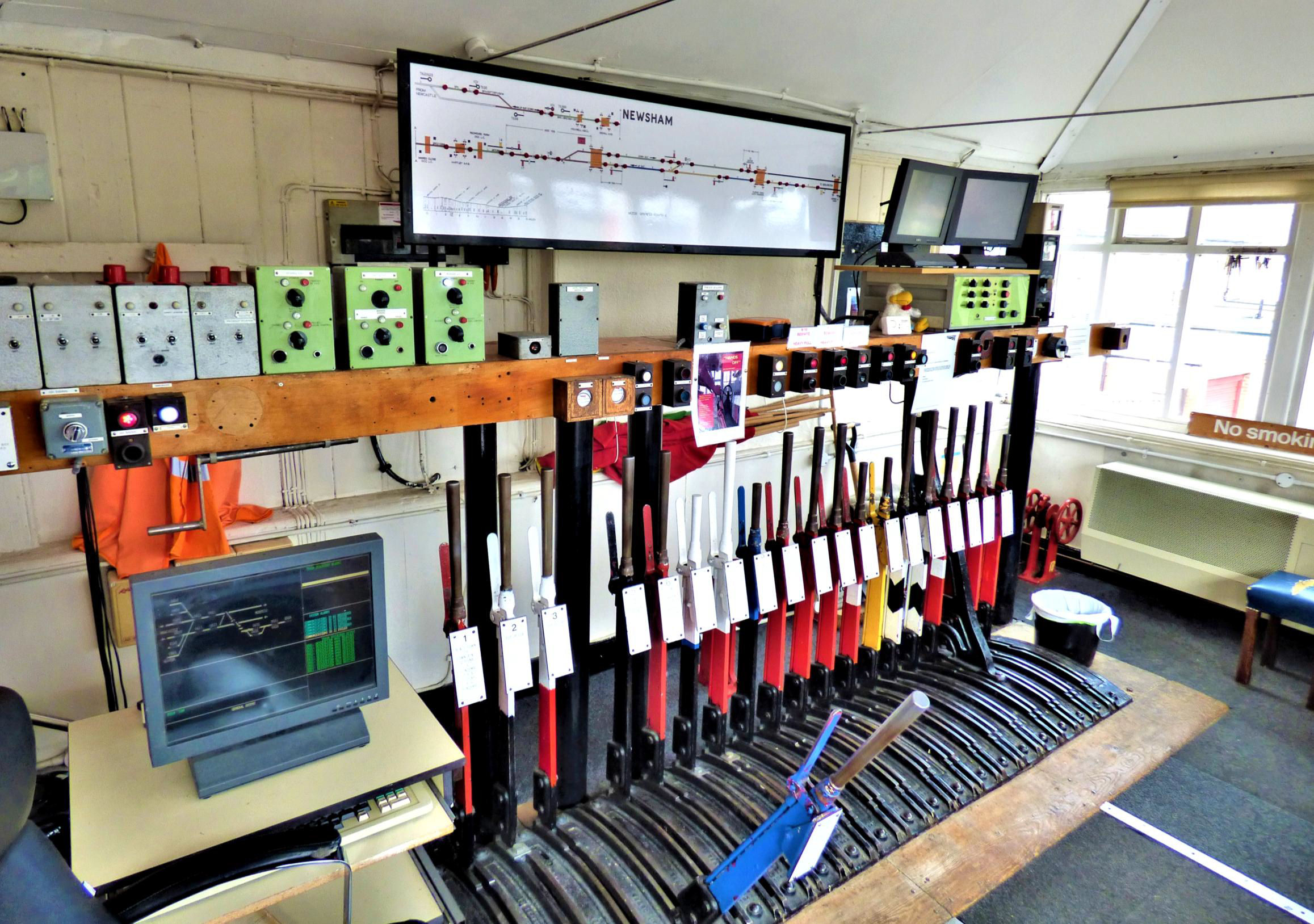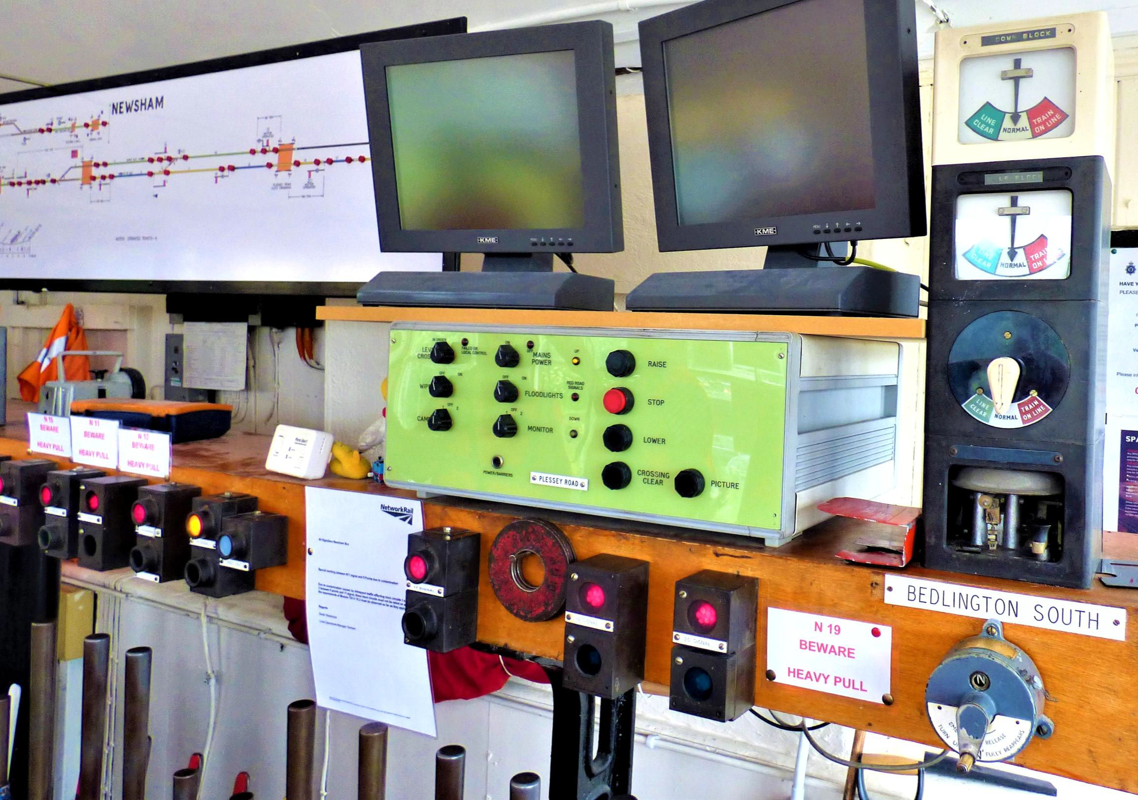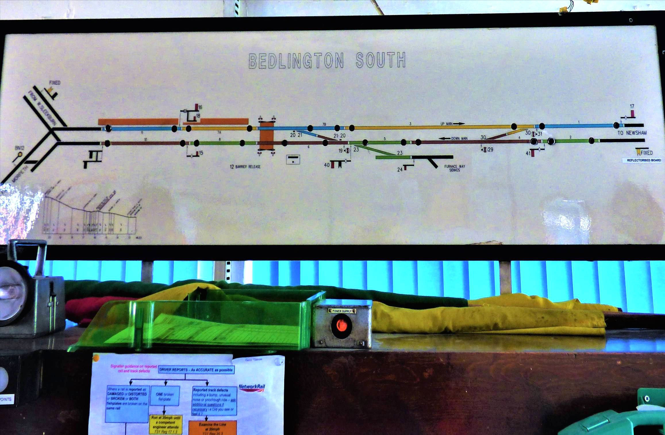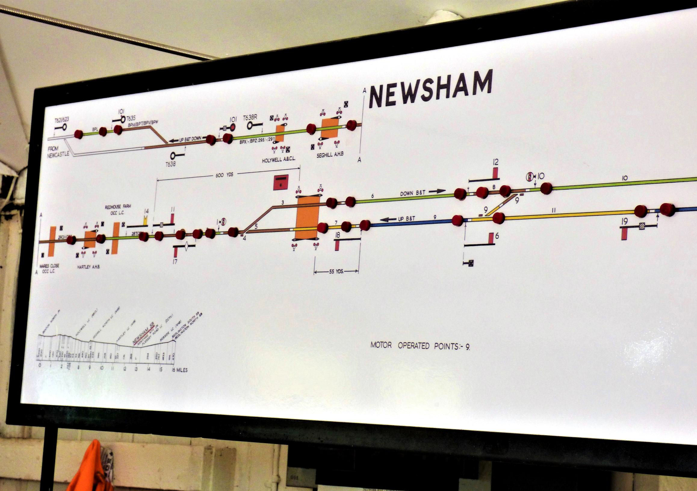 Technical Details: The Down direction (double track) towards Bedlington South Signal Box (15m 60ch) is worked Absolute Block using a standard British Railways block instrument. The Up direction, towards Benton Jn, (a seven mile single track section) interfaces with Tyneside Integrated Electronic Control Centre and is worked Track Circuit Block. Other than the Absolute Block sections north, the entire Newsham layout is track circuited. The Down line is track circuited to the overlap of the section signal to Bedlington South (No13) and the Up line from the approach to the outermost stop signal (No20).