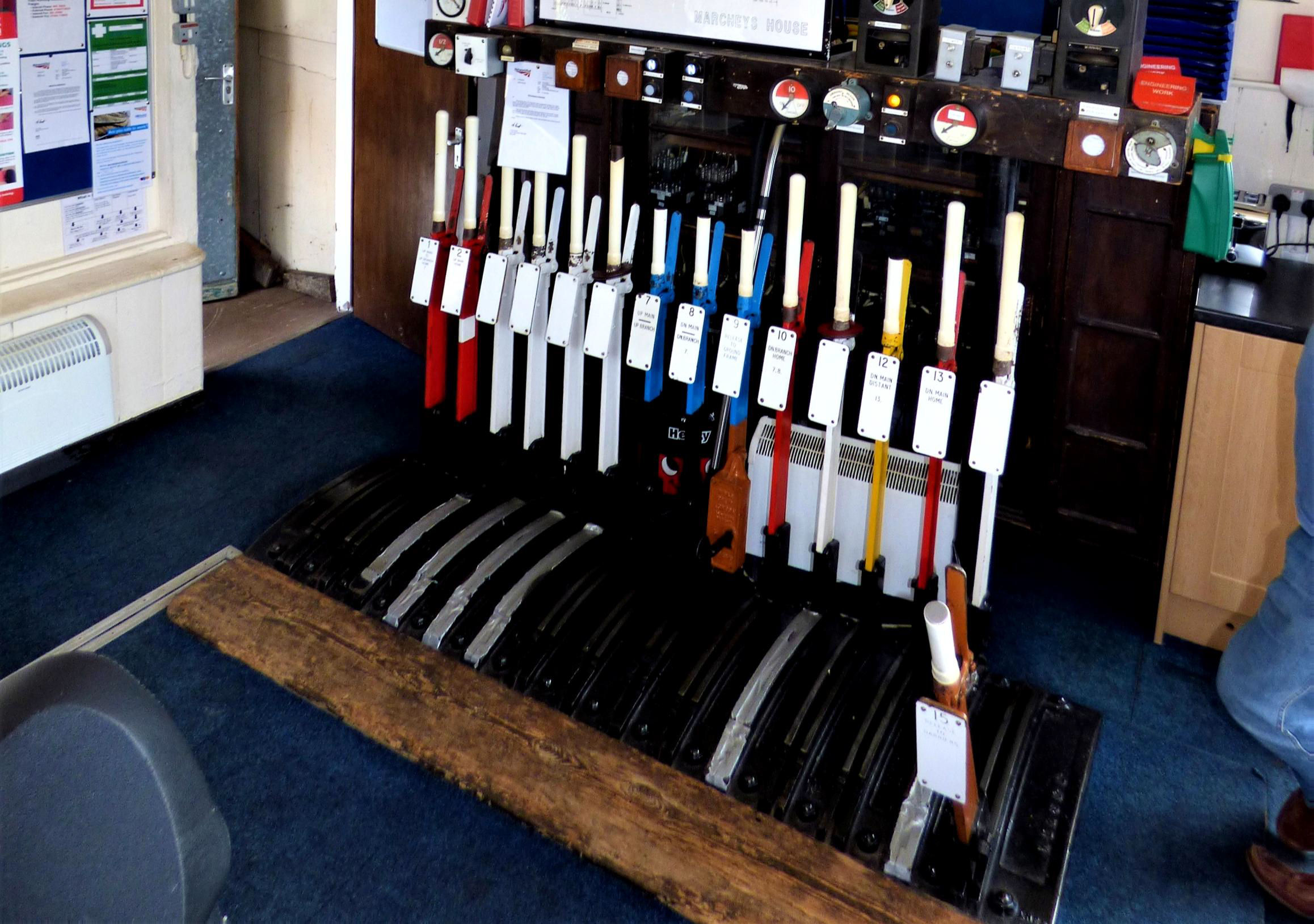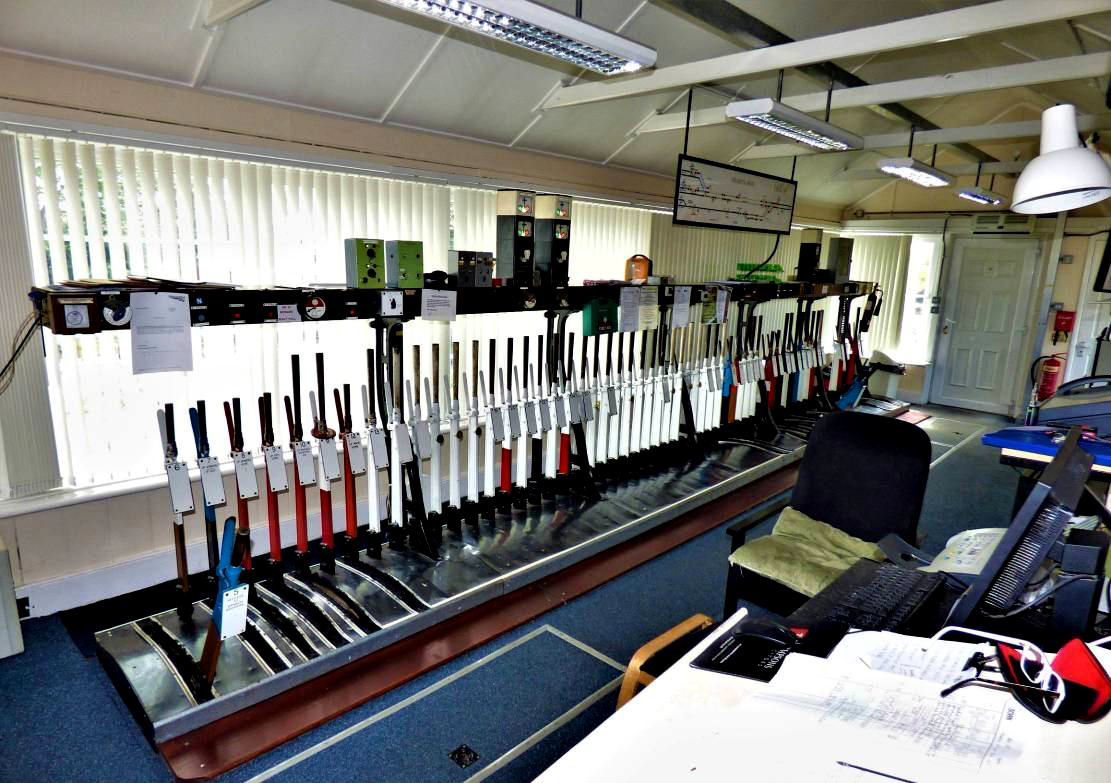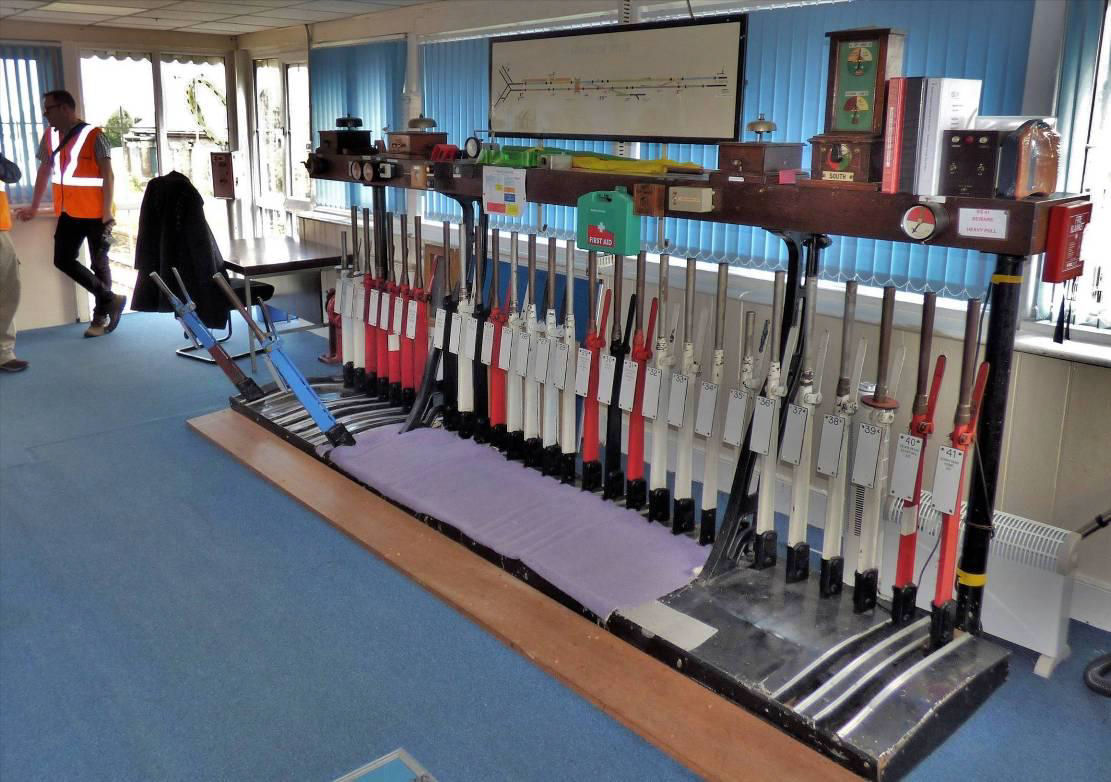 14 of the 20 levers still control signals and points. Four operational levers are shortened as they work motorised equipment. The frame is stamped 'WB&S Co Ltd' (Westinghouse Brake & Signal Co) on the floor plates and dated LNER 1943. All running and shunt signals are semaphore except No101, a switch operated colour light signal from the Tyneside direction, and the slot on T635, the signal in rear of 101.