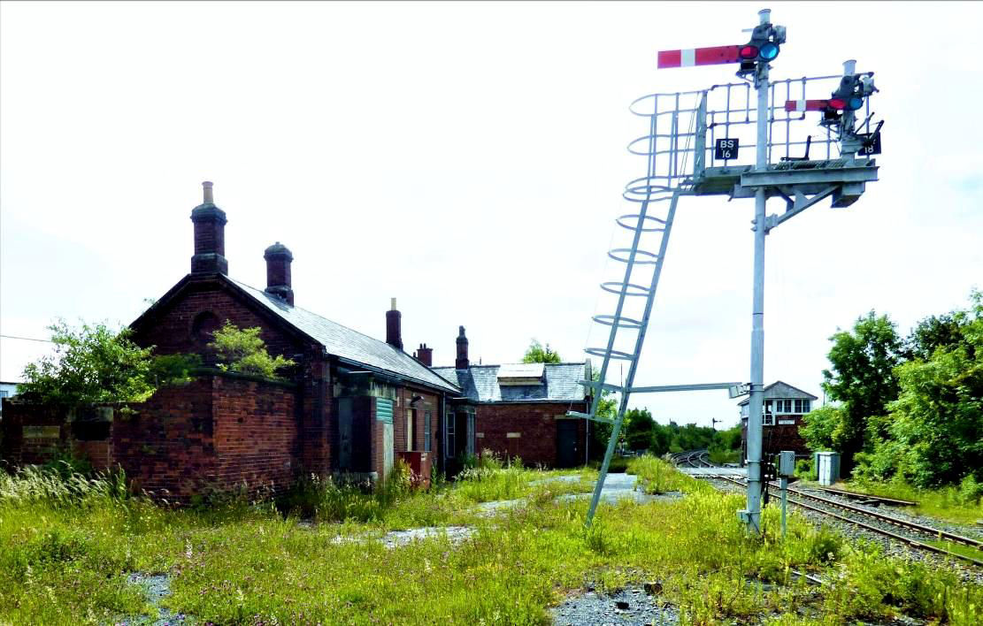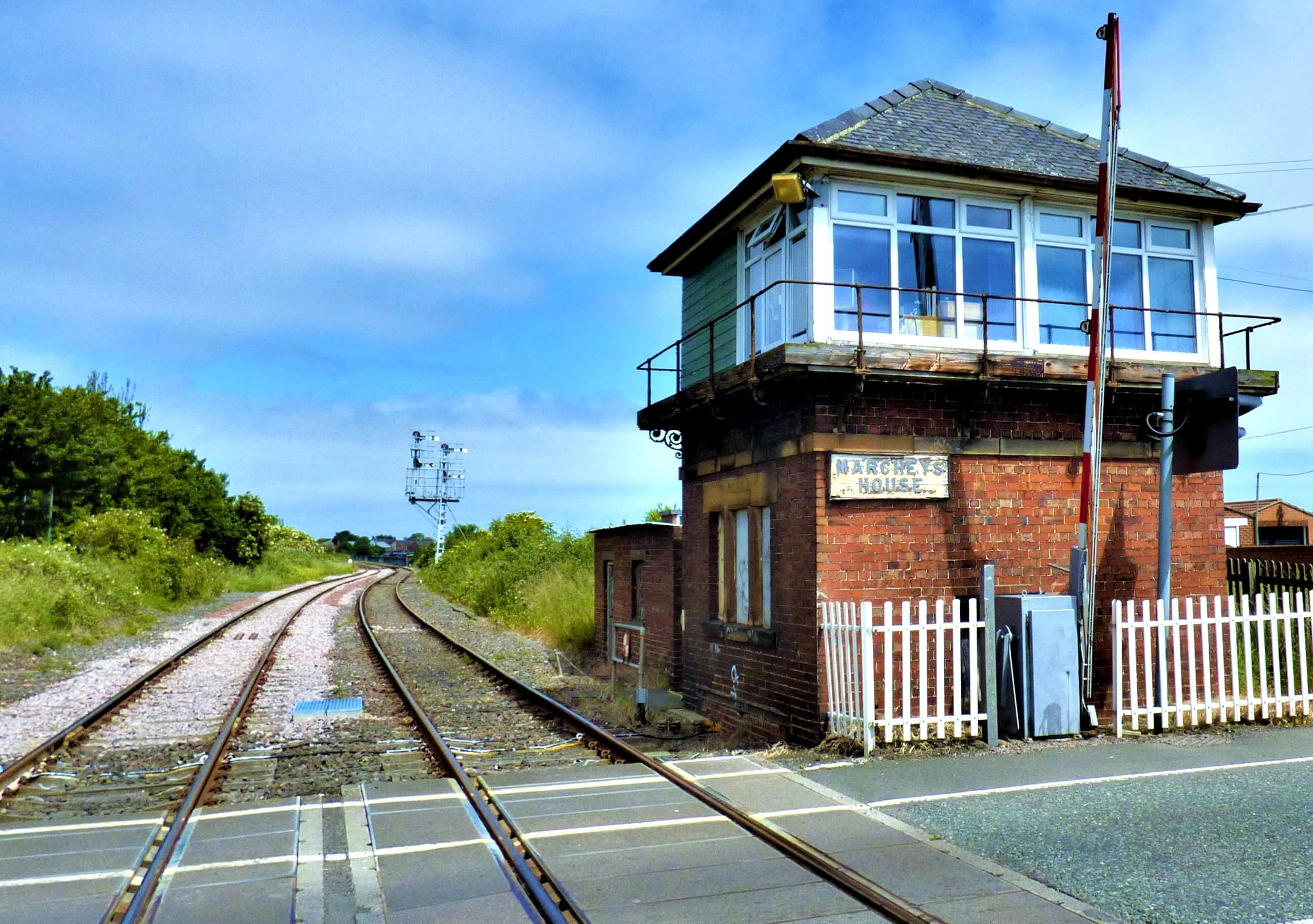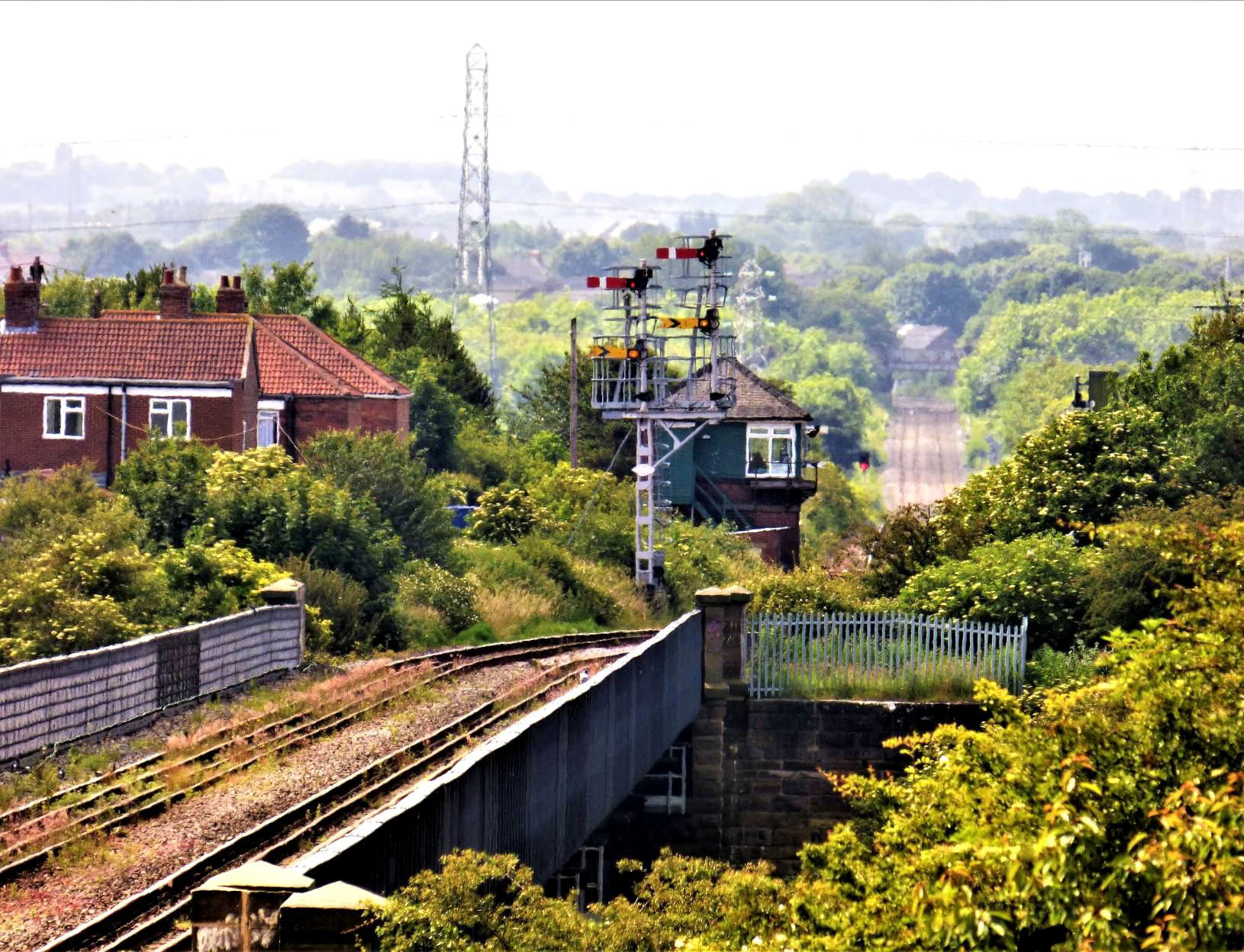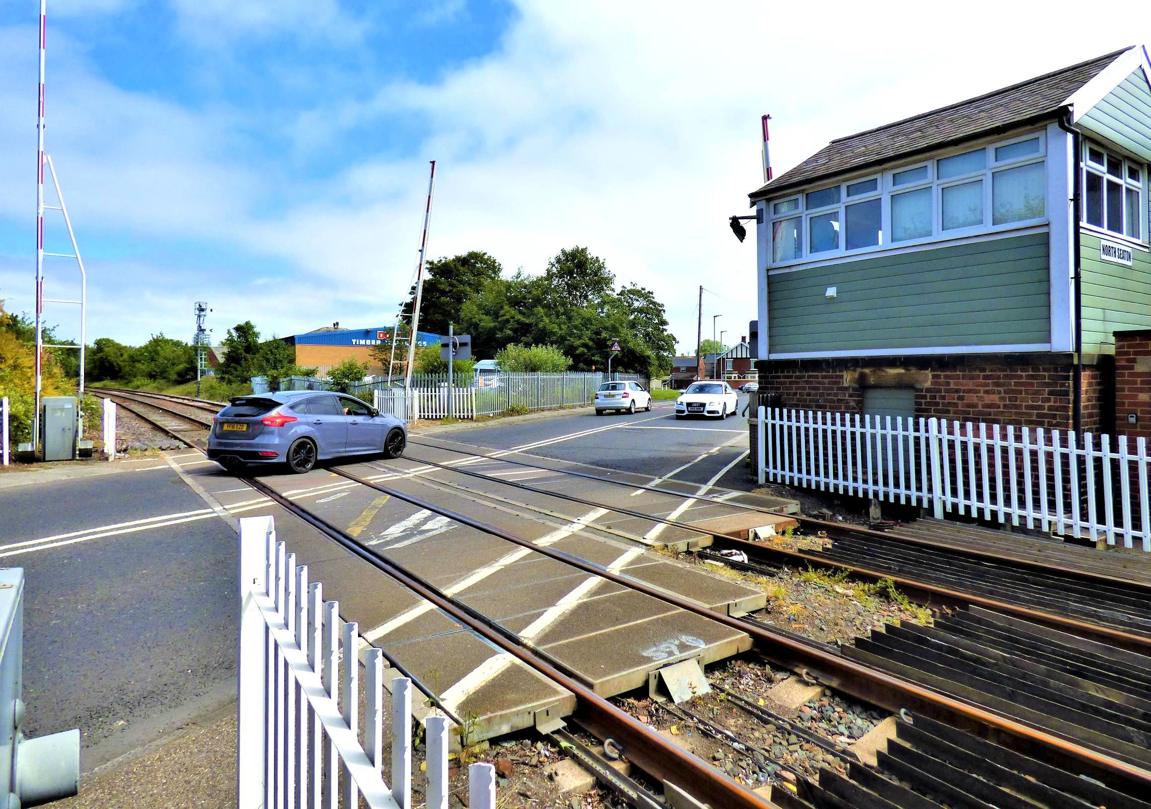 Newsham Signal Box where the double track starts heading north. The crossing is South Newsham Road (A 1061).