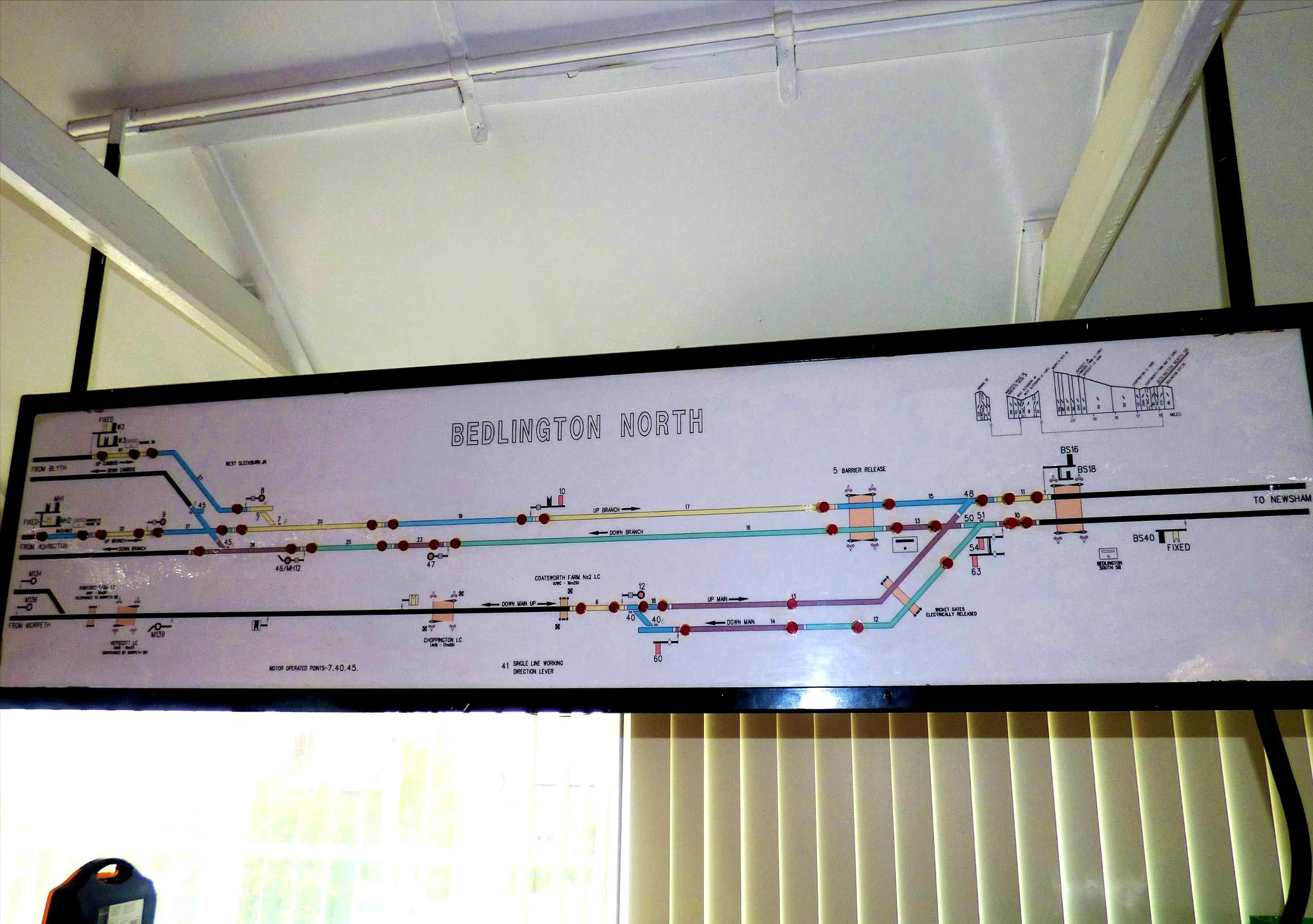 There are two crossovers, facing (at the box) and trailing at the Newsham end south. They appear intended mainly to facilitate shunting in/out of the now disused (but still connected) Down side Furnaceway Sidings (Furnace Way on the box diagram). However, railtours have been known to reverse between Morpeth and North Blyth using the crossovers. The sidings may be revived for ECS passenger stock stabling at night and cleaning if/when the line reopens (BLN 1353.1568).