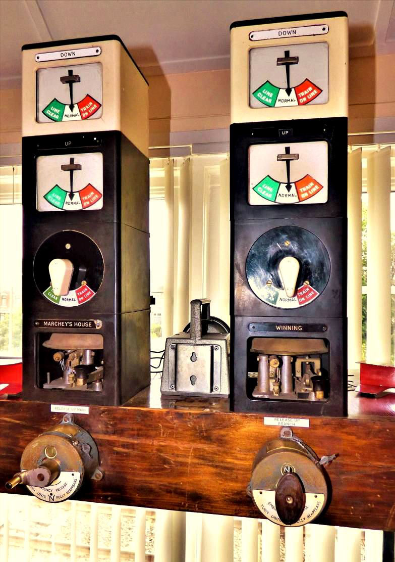 Absolute Block working applies to Bedlington North and Winning using standard British Railways block instruments. The double line to Lynemouth (via North Seaton & Hirst Lane crossings) is controlled by telephone. There are 15 levers; nine are operational, five of the latter being shortened levers. All signals are semaphores except No12, a colour light, which is the Marcheys House Down distant from Bedlington North as well as the section signal from Bedlington North (No46) to Marcheys House. Depending on conditions this signal can display a red, yellow or green aspect as required.