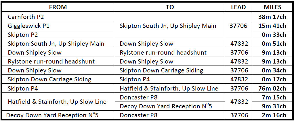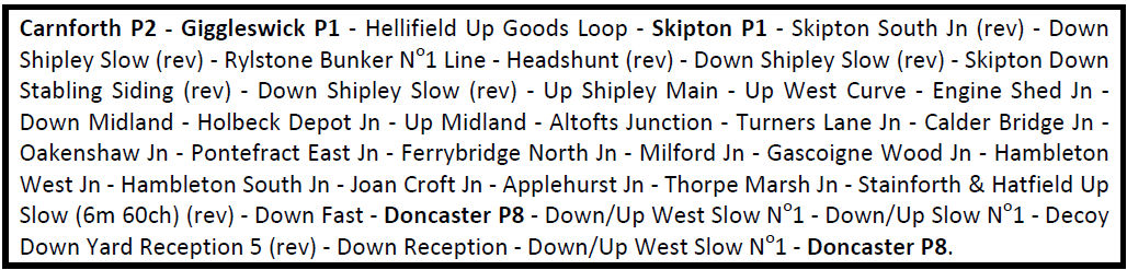 This was to reverse the train formation so that the correct loco would lead the tour around Drax Power Station loop the next day. Reversing on the Up Slow at Hatfield & Stainforth, or is it the other way round - I do go back that far? [Yes, before 28 Sep 1992 - Ed.] Our tour then ran to Doncaster where it was to terminate. However as it was only 16.08, a much appreciated 'encore' had been arranged and we crossed the ladder into P8 and the Down/Up West Slow No1 and Down/Up Slow No1 to Reception 5 (by the former Royal Mail Terminal). Reversing here our train returned to Doncaster P8 via the Down Reception. Many thanks to the tour organisers, Kev Adlam, WCR, NR and Tarmac for a great start to the weekend. It is understood that the ECS ran to St Catherine's Jn to reverse then over the ECML and via Low Ellers Curve to Wood Yard Road 12 and finally stabled locally for the night in New Lead line 1.