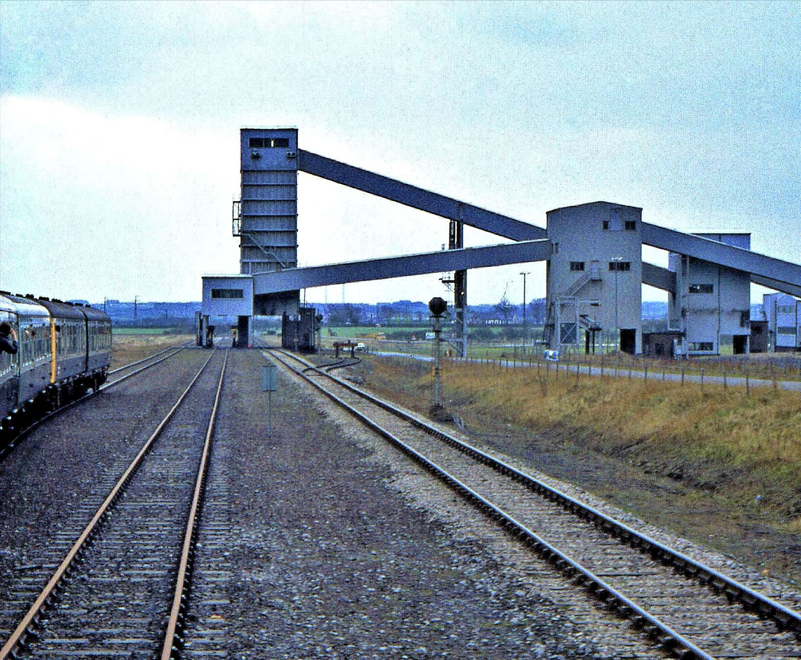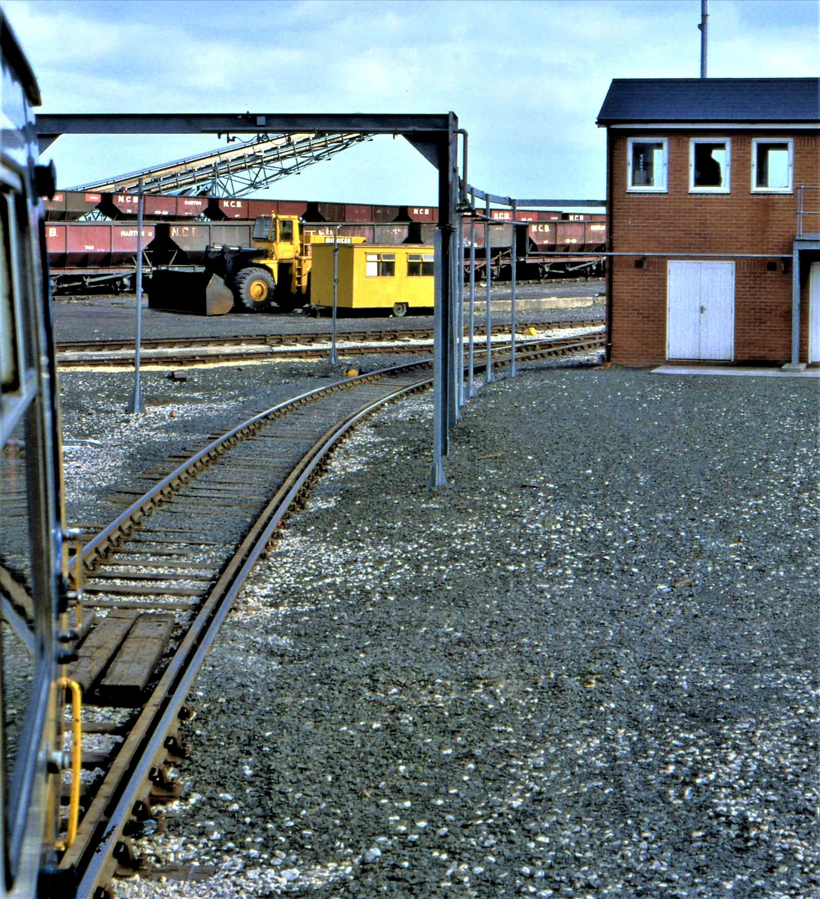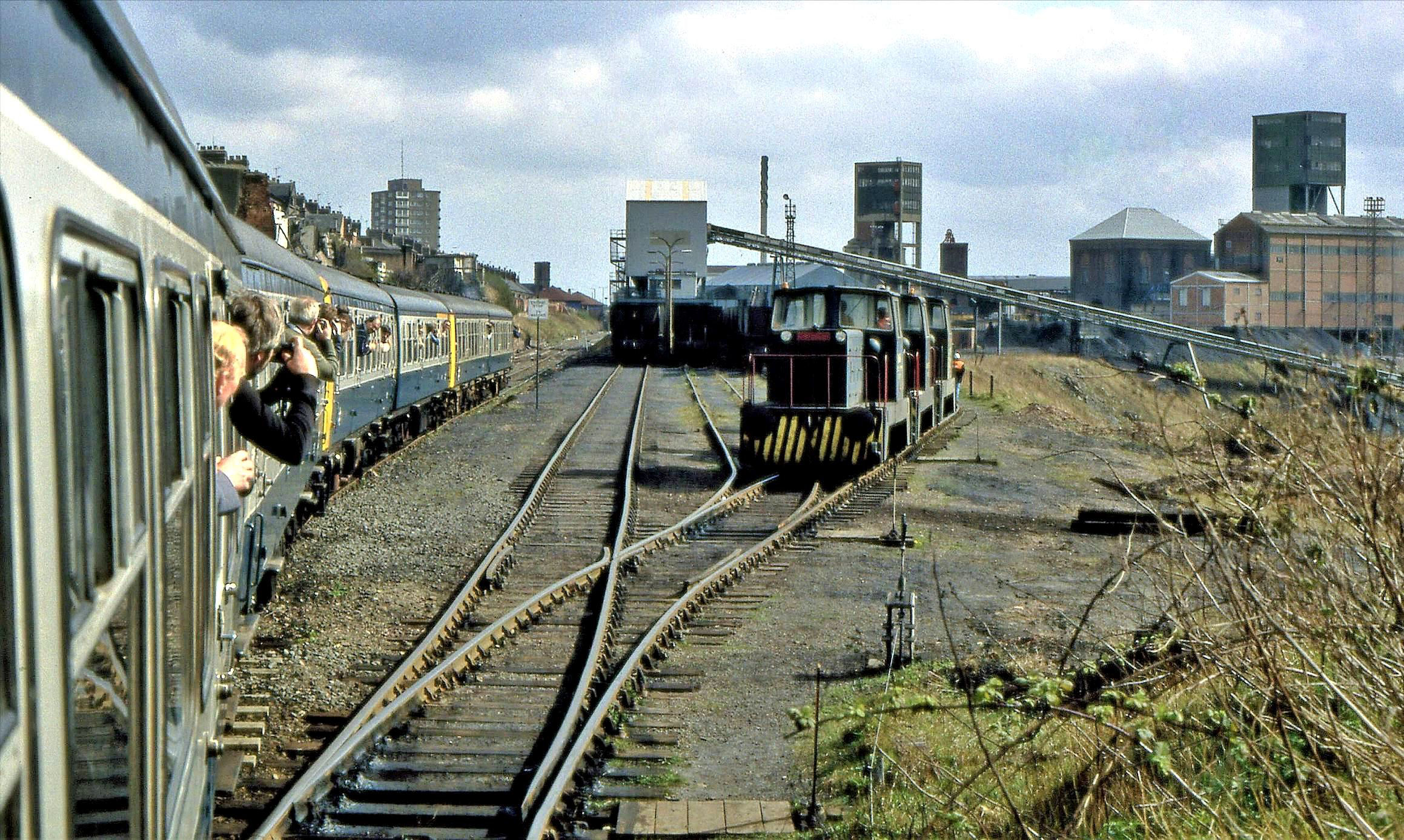 The tour reached the points at the end of the run-round loop, which terminated just before the south bank of the River Tyne. After returning to, and reversing at, Green Lane Jn, Westoe Colliery was next, where the loco stabling point was reached. The tour was originally due to run to the loading pad after reversing beyond where it actually reached, but timings did not permit this. Westoe was notable for its overhead electric system, operated by German built locos with cut down cabs due to some low bridges. By the time of the tour, electric working was just on the Hilda Sidings to Harton Low Staiths section, which could not be seen from the train. Coal shipments from the staiths had ceased, but mine waste was still being sent that way. Final closure of the staiths branch came on 19 Jul 1989; it was replaced by a conveyor belt during the colliery holidays, and the colliery itself later closed in 1993.