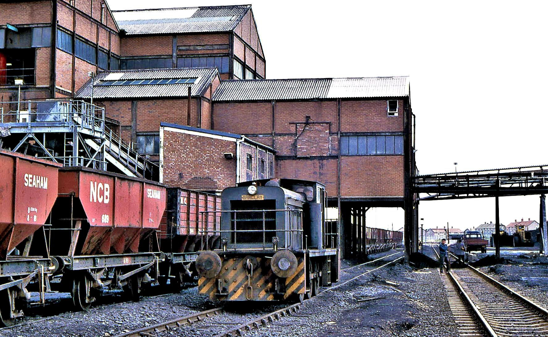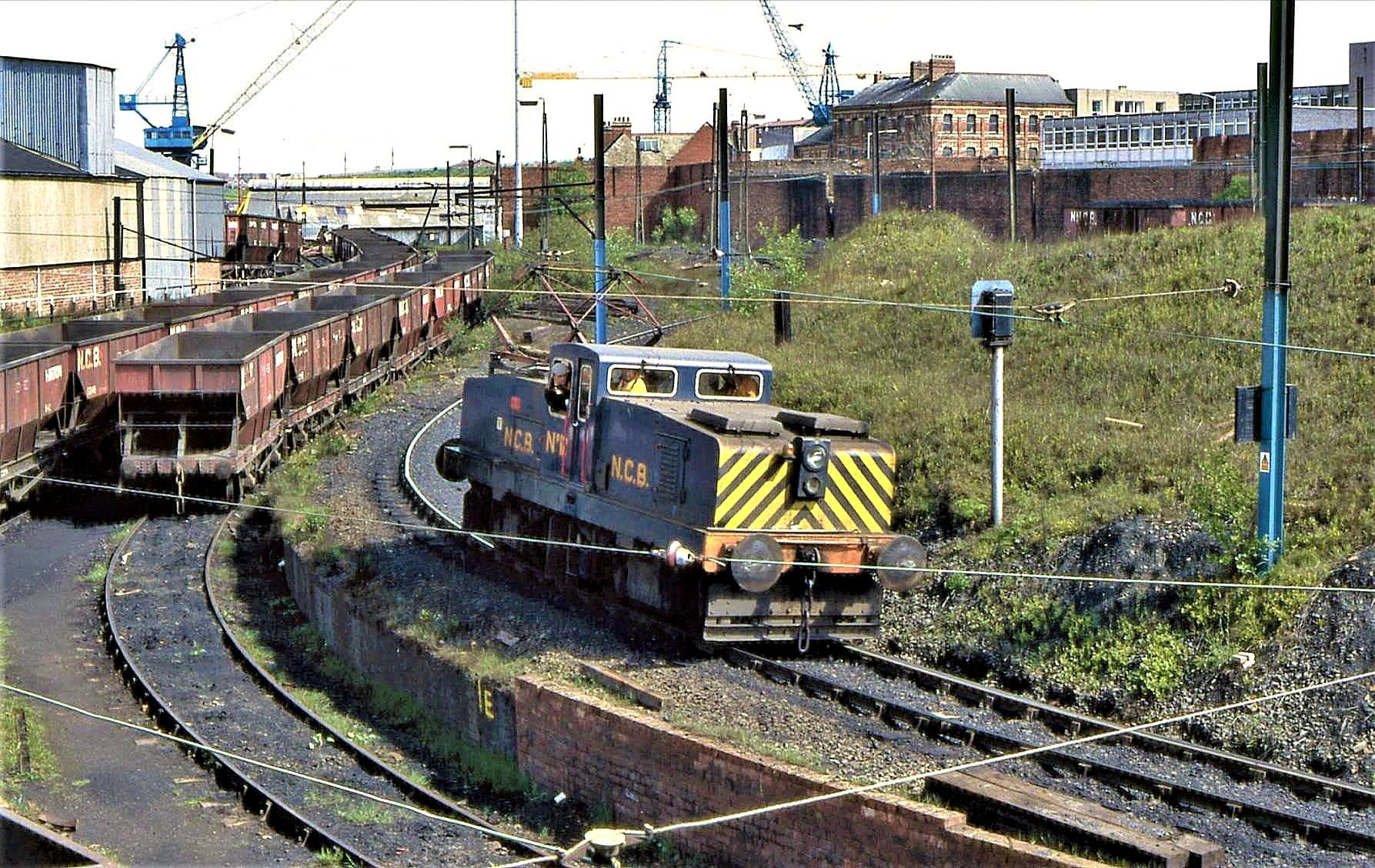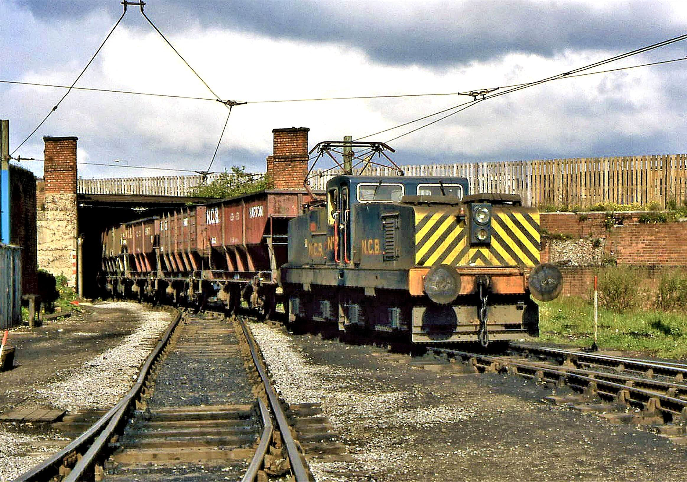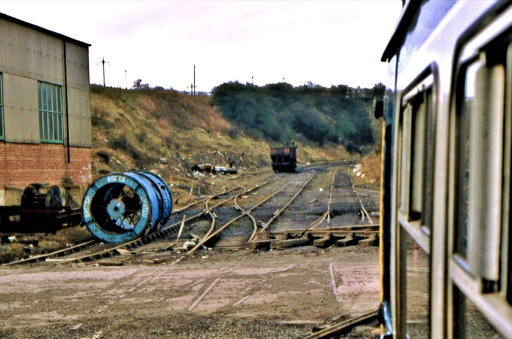 The tour reached the points at the end of the run-round loop, which terminated just before the south bank of the River Tyne. After returning to, and reversing at, Green Lane Jn, Westoe Colliery was next, where the loco stabling point was reached. The tour was originally due to run to the loading pad after reversing beyond where it actually reached, but timings did not permit this. Westoe was notable for its overhead electric system, operated by German built locos with cut down cabs due to some low bridges. By the time of the tour, electric working was just on the Hilda Sidings to Harton Low Staiths section, which could not be seen from the train. Coal shipments from the staiths had ceased, but mine waste was still being sent that way. Final closure of the staiths branch came on 19 Jul 1989; it was replaced by a conveyor belt during the colliery holidays, and the colliery itself later closed in 1993.