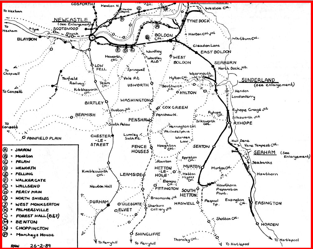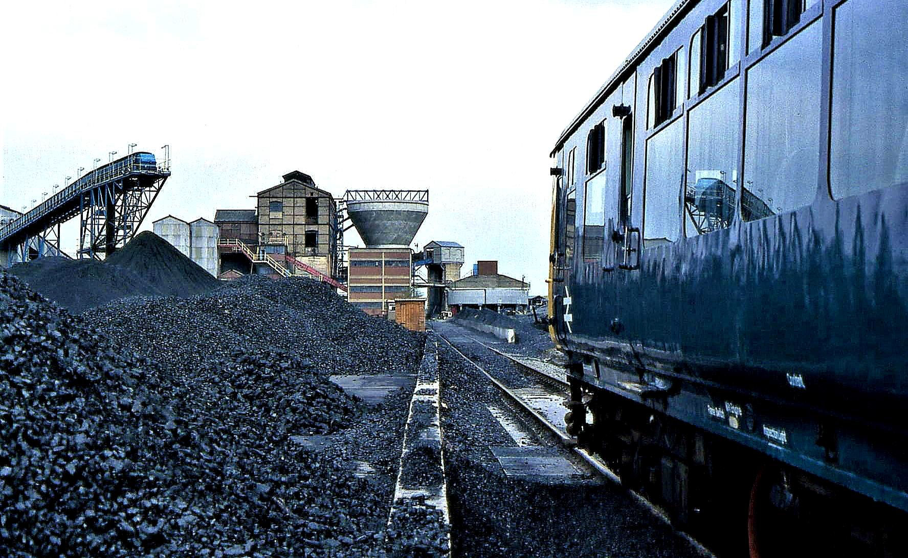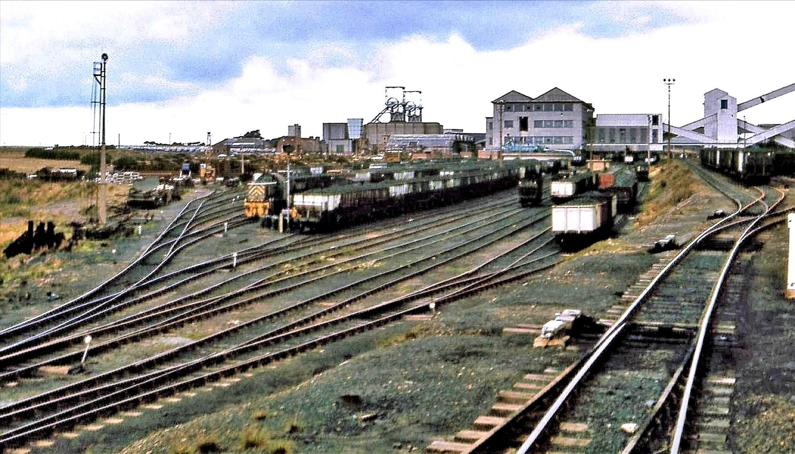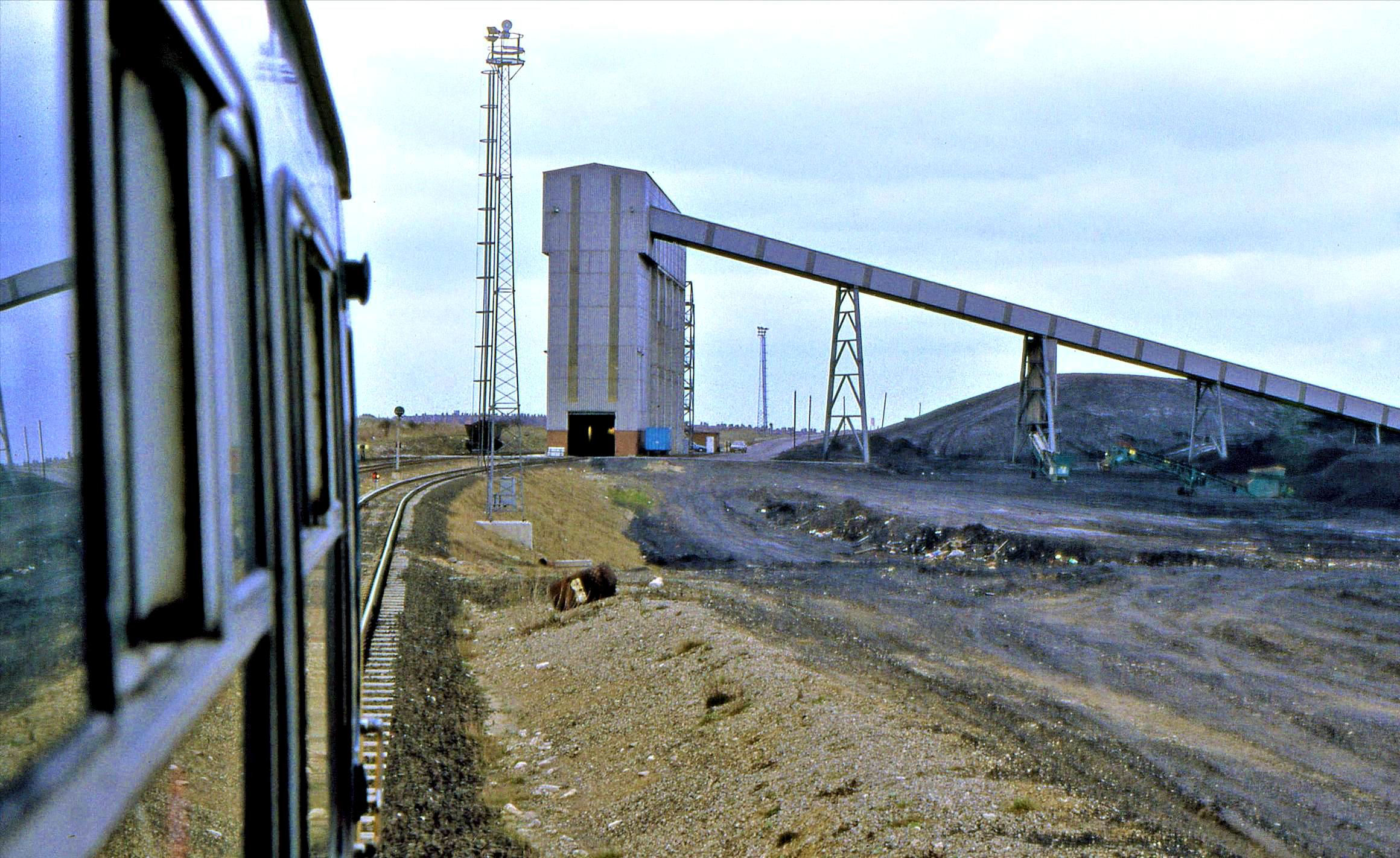 Open casting ceased here in 1991, and the line was later closed (due to repeated vandalism) between New Moor Level Crossing (LC) (4m 17ch) and Ashington Jn (3m 03ch). After many years of disuse, what remained of the line came back into use from 2010 as a branch from Butterwell Jn for coal traffic from Potland Burn Opencast Site, loaded by New Moor LC. In Apr 2015 Butterwell bunker came back into use, but only for a short time, as the line finally became defunct in early 2016. The 1989 tour was the first (of many such firsts!) to proceed along British Coal's single track Butterwell Light Railway (worked past Butterwell in this direction only) to Ashington, where the colliery had closed the year before. Ashington Colliery was notable for its use of ex-Western Region Class 14 locos. After reversal, the train ran to Lynemouth Colliery (end of the bunker line). It was linked underground with Ellington, closed by British Coal in 1994, but reopened by RJB mining (later UK coal). Mining finally ceased in 2005 due to flooding. Most output was supplied by conveyor belt to the adjacent Lynemouth Power Station (opened 1972 by Alcan to supply their nearby aluminium smelter), although some went out by rail. The power station was (and is) rail served, now converted to burning biomass rather than coal.