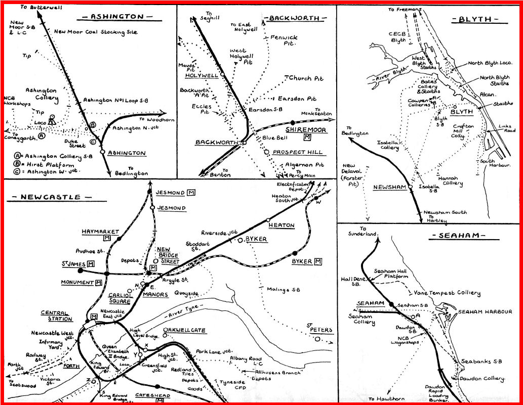 A packed 6-coach train, three 2-car DMUs, left Newcastle promptly at 09.00, first running north through Morpeth to Butterwell Jn. Here it turned right past the British Rail boundary onto the run-round loop bypassing Butterwell bunker, opened in 1977. It was the loading point for a nearby opencast site, then the largest man-made hole in Europe.